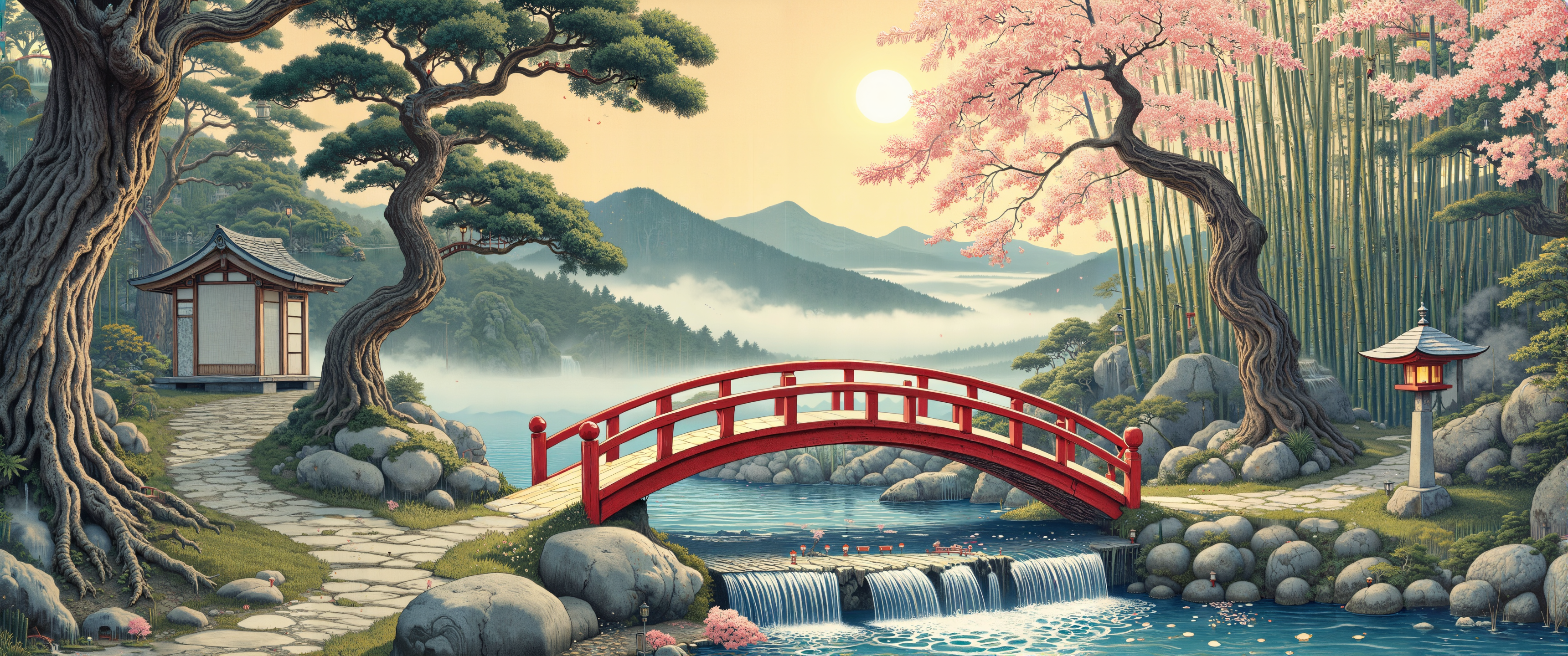 Traditional Japanese strolling garden (kaiyū-shiki) at sunrise, viewed from elevated pavilion, rendered in nihonga style with mineral pigments on handmade washi paper. Ancient gnarled pine trees frame meandering stone pathway leading to vermilion wooden bridge arching over fog-shrouded koi pond. Morning light filters through bamboo grove creating dappled shadows across moss-covered stones. Miniature waterfall tumbles between weathered granite boulders, scattered cherry blossom petals floating on rippling water surface. Stone lanterns with patina of age illuminate secluded meditation alcove. Background reveals distant mountains in layered blue-gray ink wash technique. Ethereal composition balances negative space (ma) with detailed foreground elements. Gold leaf accents highlight dawn mist rising from water. Seasonal indicators of early spring with subtle wabi-sabi aesthetic celebrating imperfection and transience. <lora:RM_JamesJean_v0.5:0.2> <lora:ck-painterly-fantasy-000017:0.2> <lora:UkiyoFusion-FLUX:0.5> <lora:Hyperdetailed_Colored_Pencil:0.1> <lora:flux_dev:1>