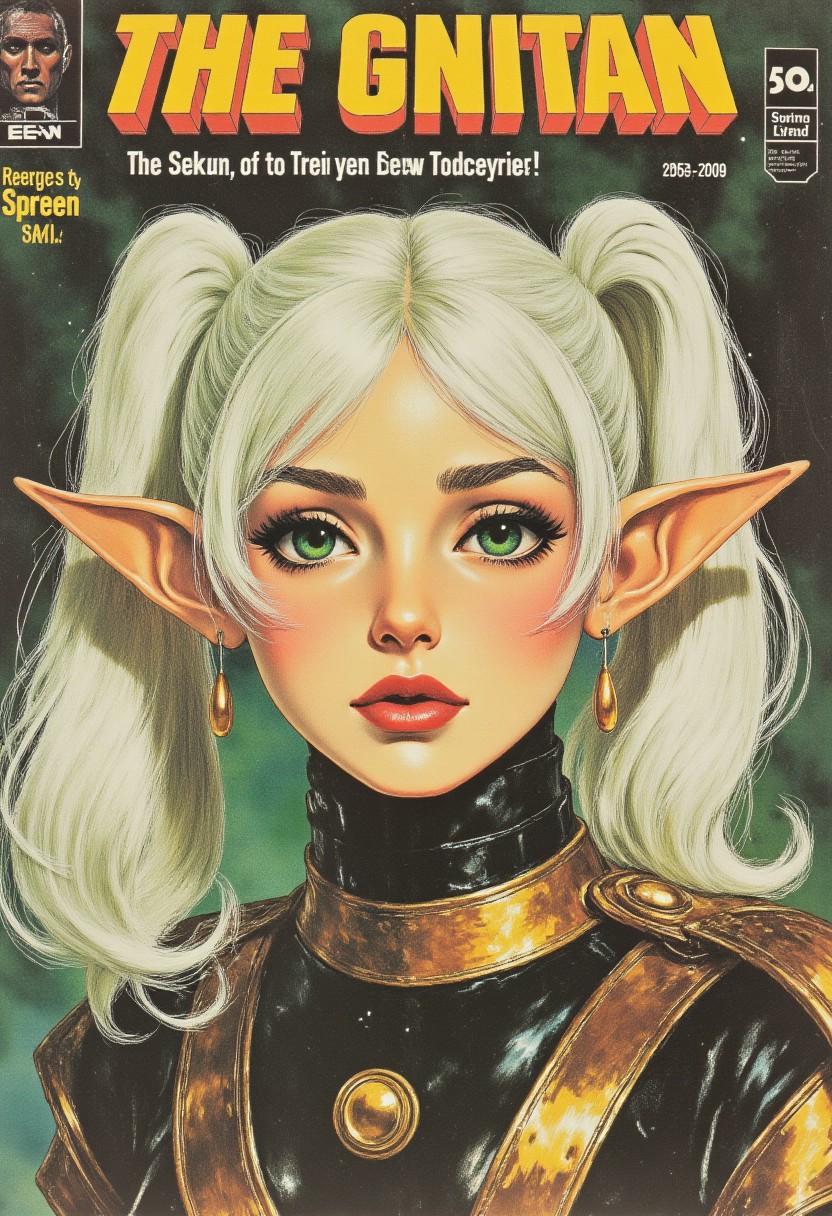 80s vintage pulp sci-fi magazine cover, nereirfpnxl, frieren, elf, pointy ears, green eyes, white hair, twintails