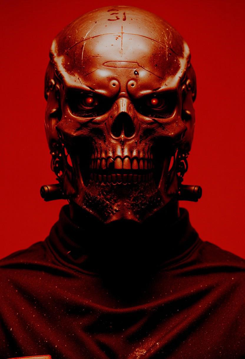 A menacing, close-up portrait depicts a cyborg character with a skeletal, metallic face and glowing red eyes, exuding an aura of menacing aggression against crimson backdrop. The mechanical mask features a wide, toothy grin filled with sharp teeth. Detailed metallic plating and intricate mechanical components expose the character's robotic nature. The top half of the character wears a darkly colored uniform, with patches and insignias adding details to the sci-fi industrial aesthetic. The composition uses strong central framing, with harsh lighting illuminating the metal face and contrasting with the blood-red background, enhancing the dramatic effect. This piece combines cyberpunk aesthetics with the gritty realism of industrial design. The style integrates digital painting techniques with a graphic art style. The overall mood evokes a sense of threat and dystopian futurism. (((visible through layers of optical, ghostly light leaks and chaotic chromatic aberration))) Hide
