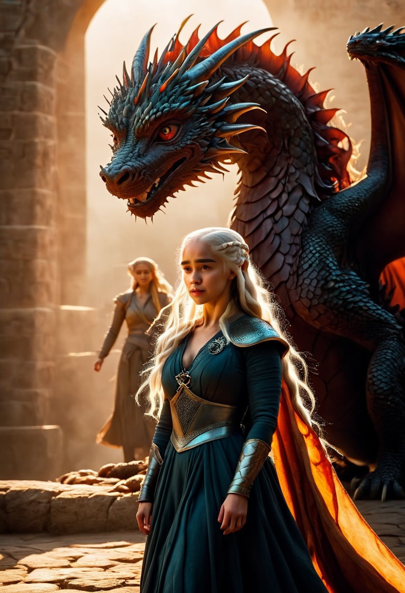 score_9,score_8_up,score_7_up, a young woman, 20year-old (Daenerys Targaryen:1.5), ((Daenerys Targaryen)), with long blond hair in a long braid, hips (thin:1.4), ((full body)), stands closely beside a majestic black dragon, ((size difference)), The dragon's large amber eye is prominently visible, head to head, conveying a sense of ancient wisdom and power, The background is softly blurred, focusing attention on the captivating duo, creating an atmosphere of mystery and enchantment, The scene exudes a powerful connection between the warrior and her mythical companion. Low lighting, chiaroscuro lighting, deep shadows, ultra realistic, elegant, very detailed, intricate details, sharp focus, depth of field, medium shot, professionally color-graded, bright, soft, diffused light, 16K (masterpiece), best quality, expressive eyes, perfect face. ((Daenerys Targaryen))