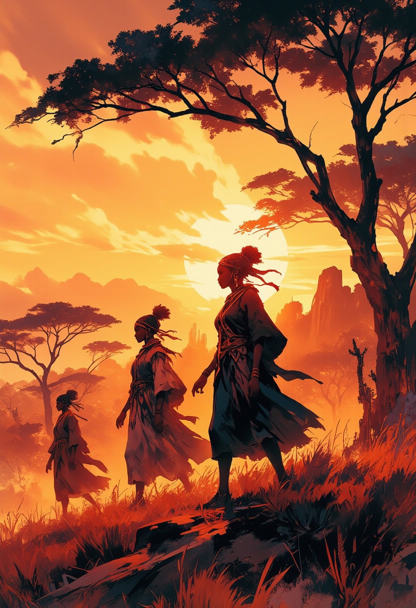 Mh1$AgThS2, intricate linework with expressive contrasts, soft lighting with dynamic highlights, image of African tribeswomen walking across a grassy savannah with acacia trees, silhouetted at sunset, chiascuro, In the style of ff-td