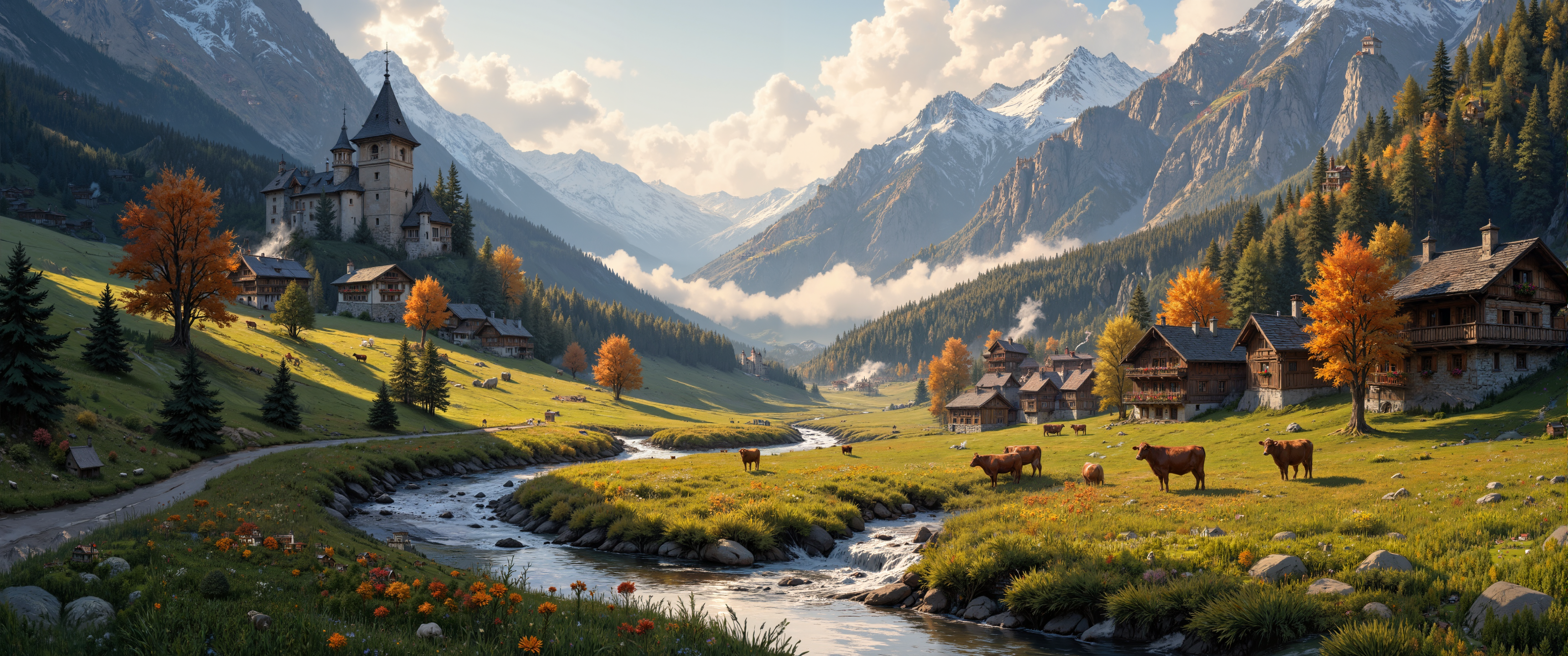 Charcoal and pastel drawing of Liechtenstein's Alpine valley at golden hour, dramatic Rhein River winding through lush meadows dotted with alpine wildflowers beneath towering limestone peaks. Medieval Vaduz Castle perches majestically on a forested ridge, silhouetted against snow-dusted mountains. Gentle mist hovers above emerald pastures where dairy cows graze peacefully. Traditional wooden chalets with flower-adorned balconies nestle in the valley floor, smoke curling from chimneys. Deciduous forests in autumn splendor create a patchwork of crimson and gold against dark evergreens. Atmospheric perspective renders distant mountains in soft blue hues, capturing the intimate scale of this microstate embraced by majestic Alps. Hyper-detailed, 8K, dramatic lighting. <lora:flux_floralizer:0.6> <lora:Ganin_II:0.7> <lora:Rainbow_on_black_style-000003:0.6> <lora:MysticFantasy:0.5> <lora:flux_dev:1>