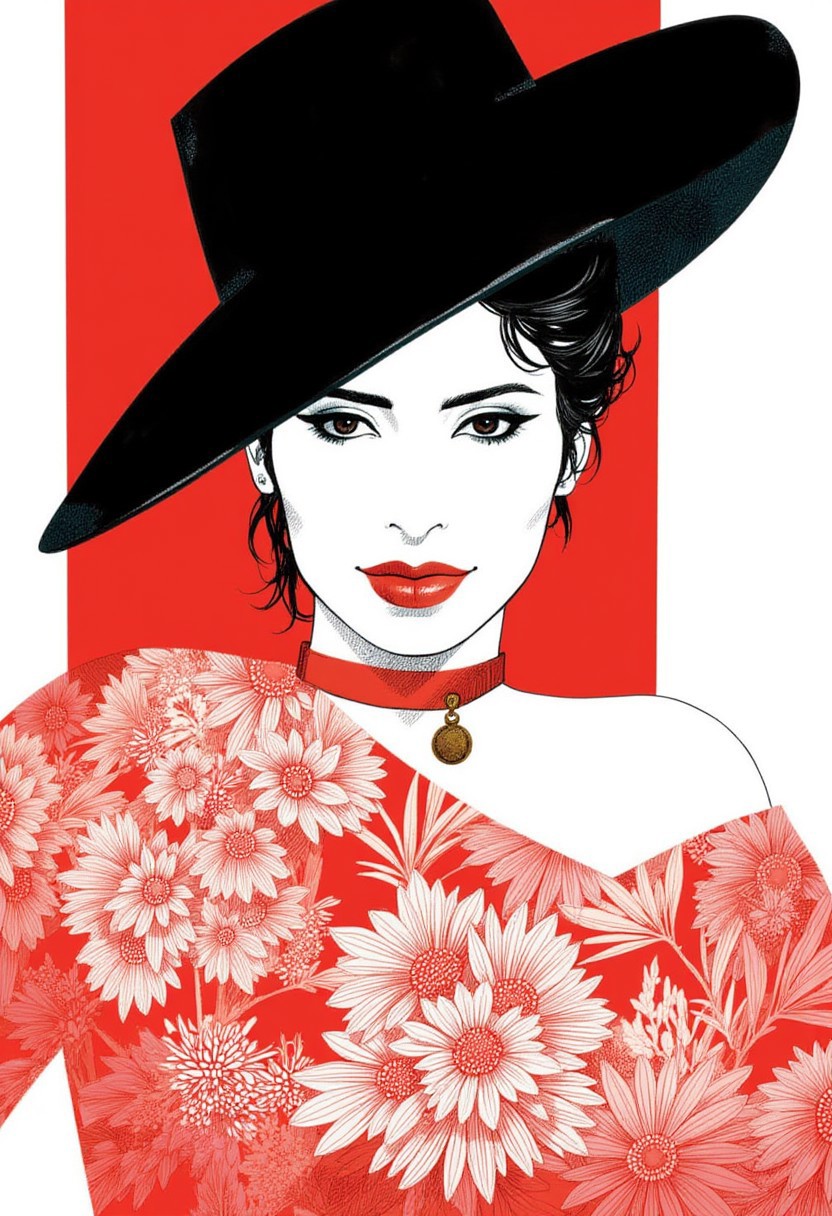 A portrait of a beautiful woman wearing black hat , illustration, Art by Sergio Toppi