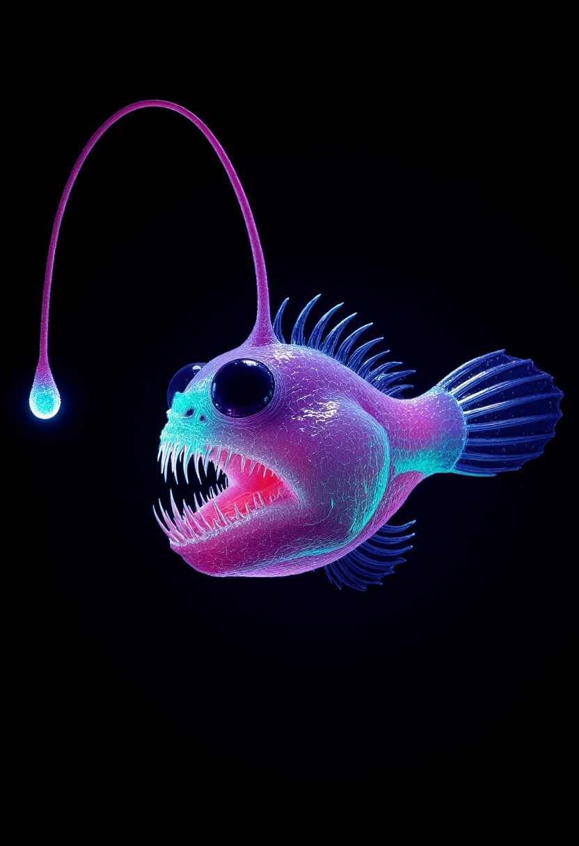 In the abyssal depths where no light dares to reach, a monstrous yet mesmerizing anglerfish drifts through the inky blackness. Its translucent body pulses with vibrant 80s neon, a shifting kaleidoscope of electric blue, hot pink, and acid green. The bioluminescent lure crackles like a synthwave skyline, casting rhythmic glows across its jagged, crystalline skin. Razor-sharp teeth shimmer like neon-lit glass shards, while oversized, ghostly eyes reflect a cybernetic void—an ancient predator reimagined in luminous hues. The water hums with an artificial radiance, thick with swirling particles that flicker like static in an old VHS tape. Shadows stretch and warp into surreal, digital phantoms, moving in sync with the angler’s eerie glow. It is both terrifying and hypnotic, like a lost fragment of a neon-drenched nightmare from a forgotten future.
