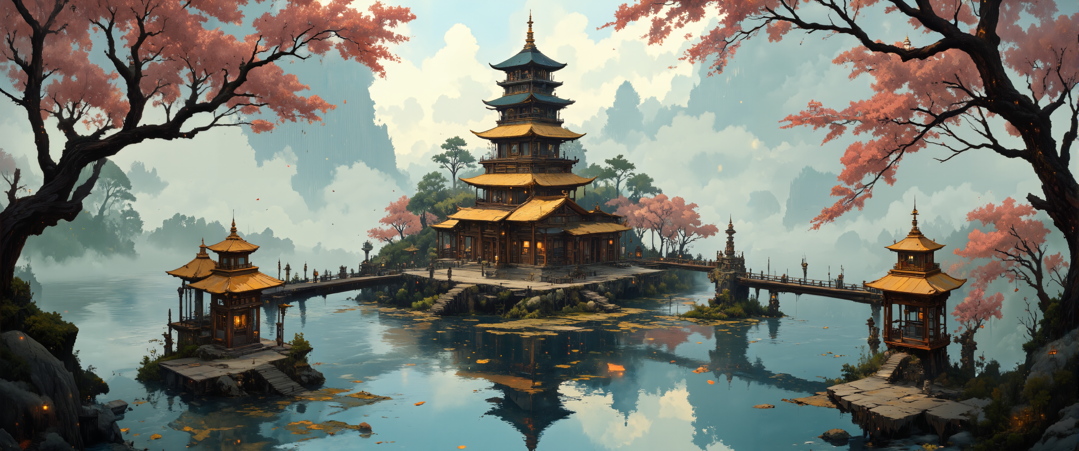 Miniature floating archipelago of tiny islands connected by delicate suspension bridges, each supporting microscopic ancient temples with ornate golden roofs. Bonsai-sized cherry blossoms frame the scene, their petals drifting onto still water below. Tilt-shift photography emphasizes the scale illusion, with selective focus on central pagoda structure. Soft morning mist hovers between islands, diffusing sunlight into gentle rays. Minuscule paper lanterns hanging from fishing lines create warm points of light. Hyperfine details in the moss-covered stone steps and weathered wood textures, 8k resolution, intricate craftsmanship, diorama lighting. <lora:Anime v1.3:0.2> <lora:New_Fantasy_CoreV4_FLUX:0.7> <lora:ArtNouveau2Flux:0.7> <lora:Fancha_style_v.5:0.5> <lora:Bruce Holwerda:0.5> <lora:flux_dev:1>
