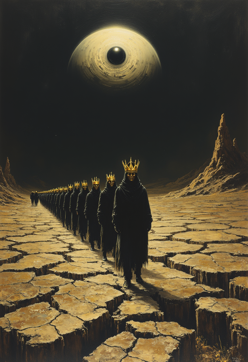 thepaintedrealm. An unsettling oil painting captures a crowned, skeletal king, draped in a robe of shifting shadows, leading a procession of silent, masked figures through a barren wasteland. The cracked earth beneath them stretches endlessly, split apart by deep, endless fissures that hum with a faint, unnatural glow. The sky above is an endless void, punctuated only by a massive, unmoving eye embedded in the heavens, watching without blinking. The figures march in perfect unison, their golden masks reflecting a world that does not exist.