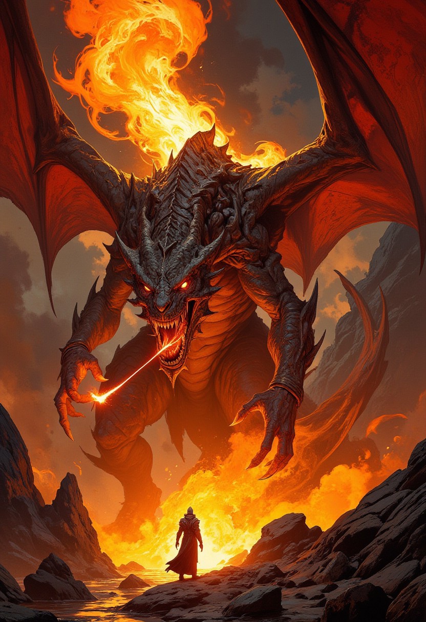huge dragon spitting fire, boris vallejo style, frank frazetta style, very detailed, masterpiece, full body, epic scene, Dungeons and dragons atmosphere, heroic fantasy, 8k, digital painting,