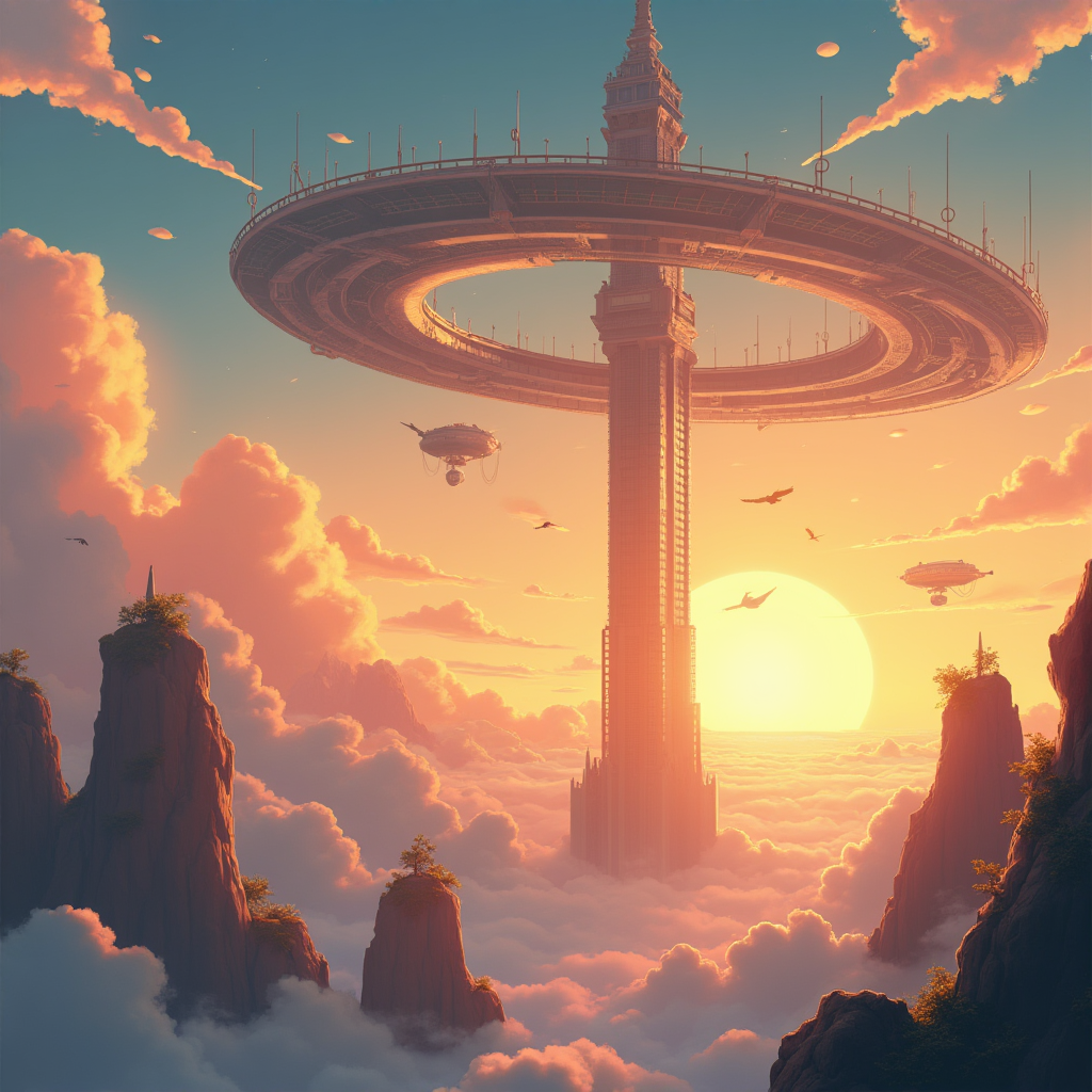 (massive space elevator:1.2) connecting (Earth surface to orbital ring:1.15), (sunset golden hour lighting:1.3), (Studio Ghibli inspired art style:1.4), (hand-painted quality:1.2), (warm color palette:1.1), (tiny detailed people and vehicles:1.05), (beautiful clouds at different altitudes:1.15), (gentle atmospheric haze:1.1), (birds flying near lower sections:0.8), (sense of wonder and scale:1.2), (floating islands near middle section:0.9)