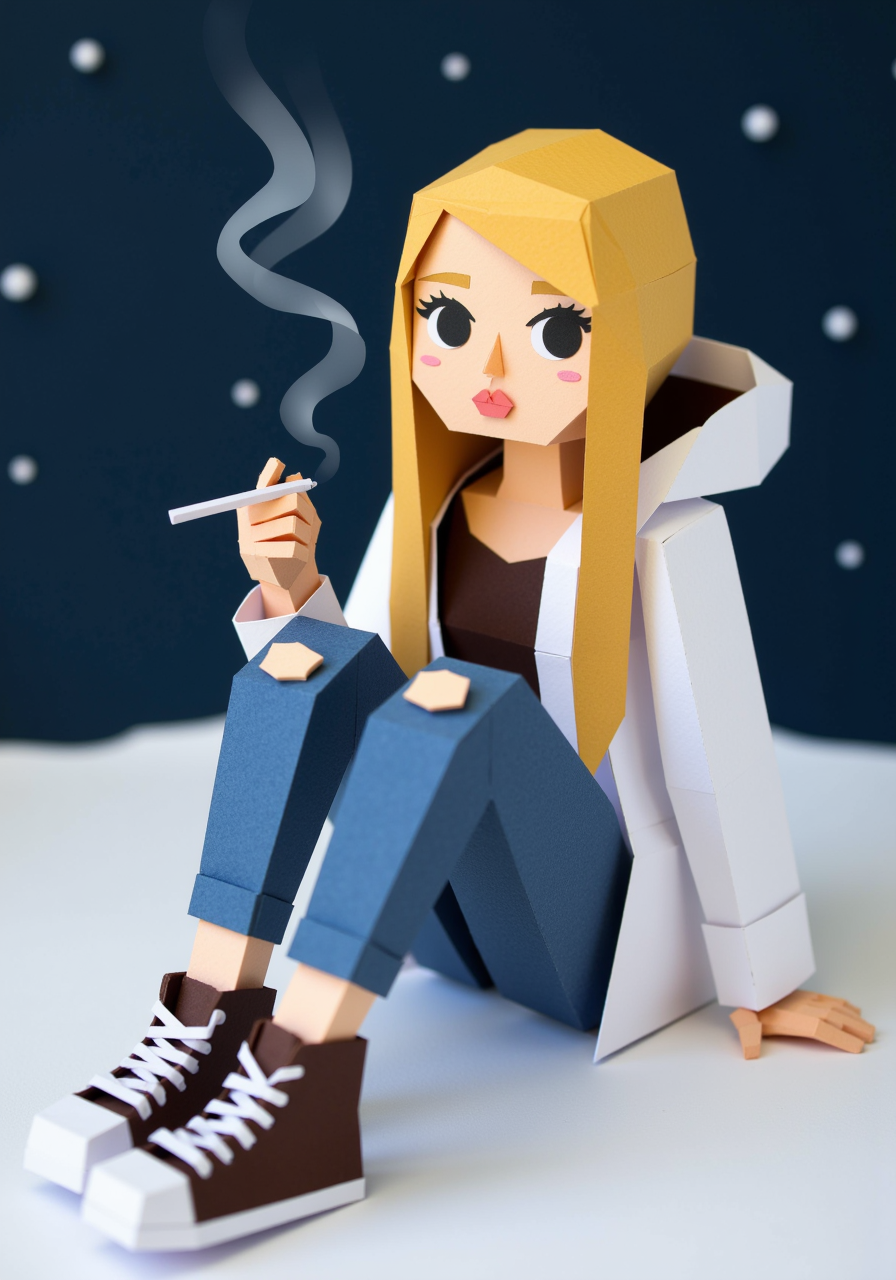 low poly papercraft scene, young woman with long blonde hair with long sideswept bangs, white parka with fur hood, holding a cigarette with slight smoke trail between her fingers, trail, pouting, long eyelashes, black eyeliner, ripped skinny jeans, high top sneakers, sitting in snow, night<lora:Low_Poly_Papercraft_Scene--Flux.safetensors:1.0:1.0>