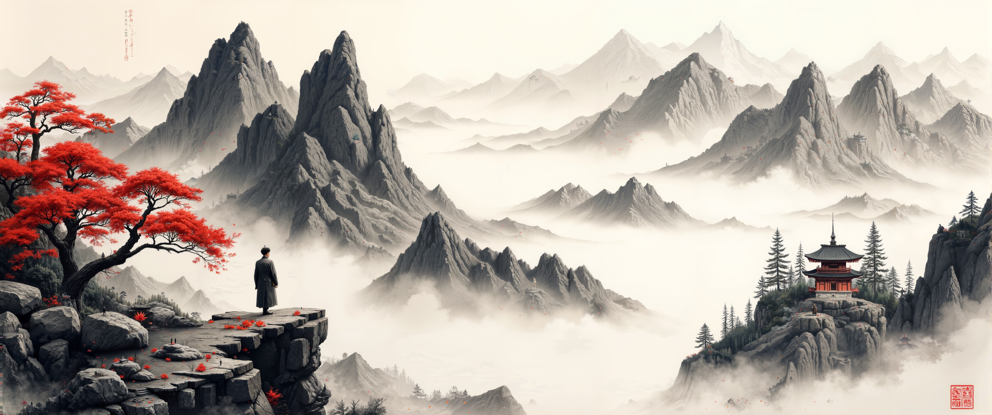 A monumental Japanese sumi-e ink painting capturing an autumn mountain landscape with dramatic vertical composition. Executed with bold, expressive brushstrokes on handmade washi paper, the scene features towering misty peaks rendered in varied ink densitiesâfrom intense black to delicate gray washes. Ancient pine trees cling to rocky outcroppings, their twisted forms created with swift, confident strokes. A small temple nestles among clouds that drift through the valley, suggested by areas of untouched paper. Scattered red maple leaves, the only color accent, fall across the foreground where a lone scholar contemplates the scene from a rocky promontory. The painting exhibits perfect balance between detailed elements and empty space (ma), with an asymmetrical composition guided by principles of wabi-sabi. A traditional red seal mark and calligraphic poem occupy the upper left corner, masterfully integrated into the landscape. <lora:FluxDFaeTasticDetails:0.2> <lora:flux_ptchkrawk:0.2> <lora:boFLUX Double Exposure Magic v2:0.5> <lora:flux_dev:1>