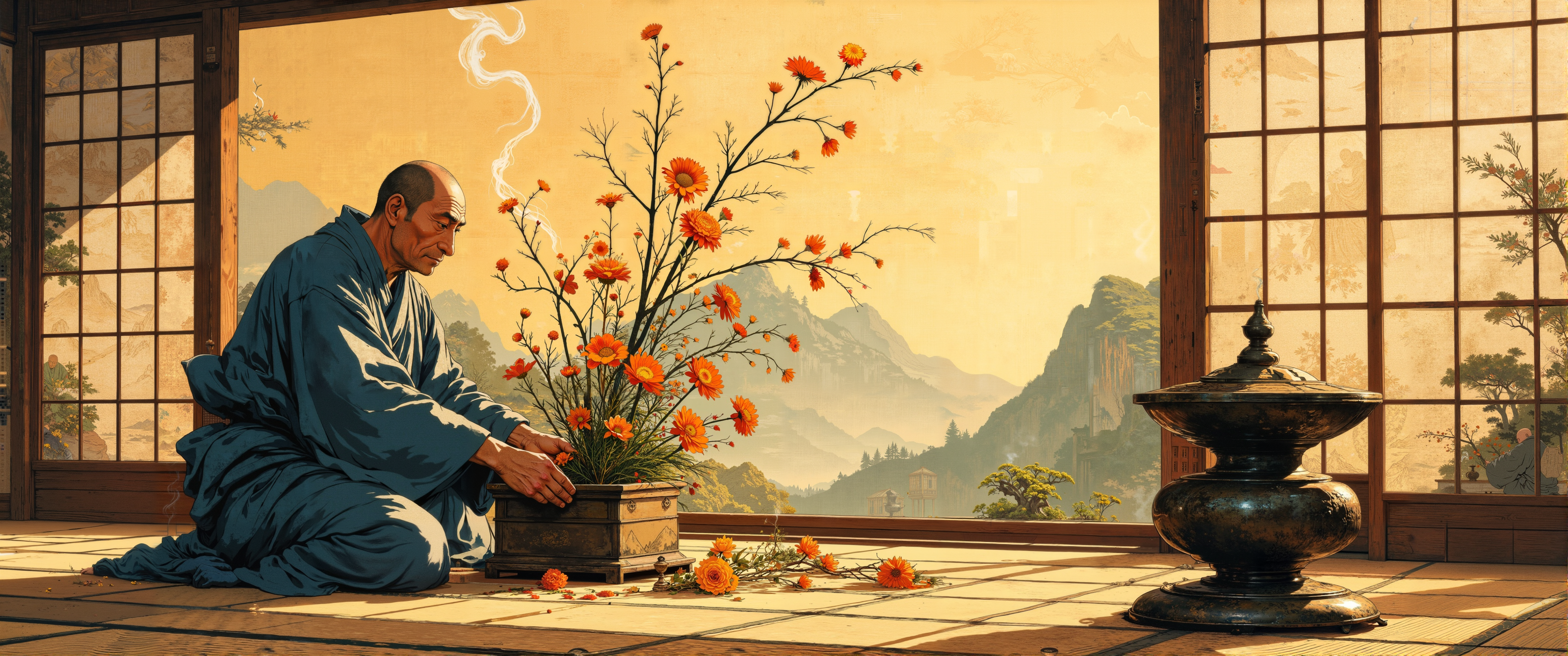 A harmonious nihonga composition depicting the ancient art of ikebana (flower arrangement) performed by a solitary monk in a secluded mountain temple, created on golden washi paper with mineral pigments and delicate sumi ink outlines. The monk, dressed in faded indigo robes, arranges wild chrysanthemums, pine branches, and autumn leaves with mindful precision, embodying the principle of kanso (simplicity). The arrangement itself suggests yugen (profound mystery) through its asymmetrical balance and intentional negative space. Shafts of evening light filter through wooden lattice windows, creating patterns of shadow and illumination across the tatami floor. A weathered bronze incense burner releases thin wisps of smoke that curl upward, visually echoing the controlled curves of the flower stems. The background reveals sliding fusuma panels painted with muted landscapes of distant mountains, expressing the concept of shizen (naturalness) through subtle gradations of indigo and burnt umber. The entire scene captures shizuka (tranquility) and the quiet dignity of dedicated practice, rendered with meticulous attention to textures and the gentle interplay of seasonal elements. <lora:RM_Enhancer_v1.0_bf16:0.2> <lora:Classic_Anime_Colors:0.5> <lora:flux_dev:1>