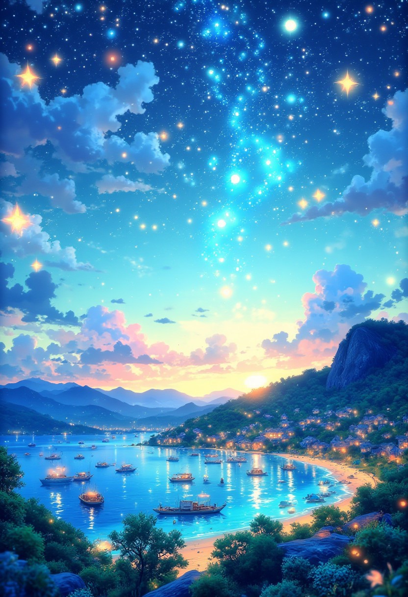 Puerto Princesa Bay Under a Starry Night "The coastline of Puerto Princesa glows under a mesmerizing starry sky, with the calm waters of Honda Bay reflecting both the city lights and the celestial glow above. The lush silhouette of Palawan’s forests creates a beautiful contrast against the urban landscape, while fishing boats drift quietly under the cosmic expanse."