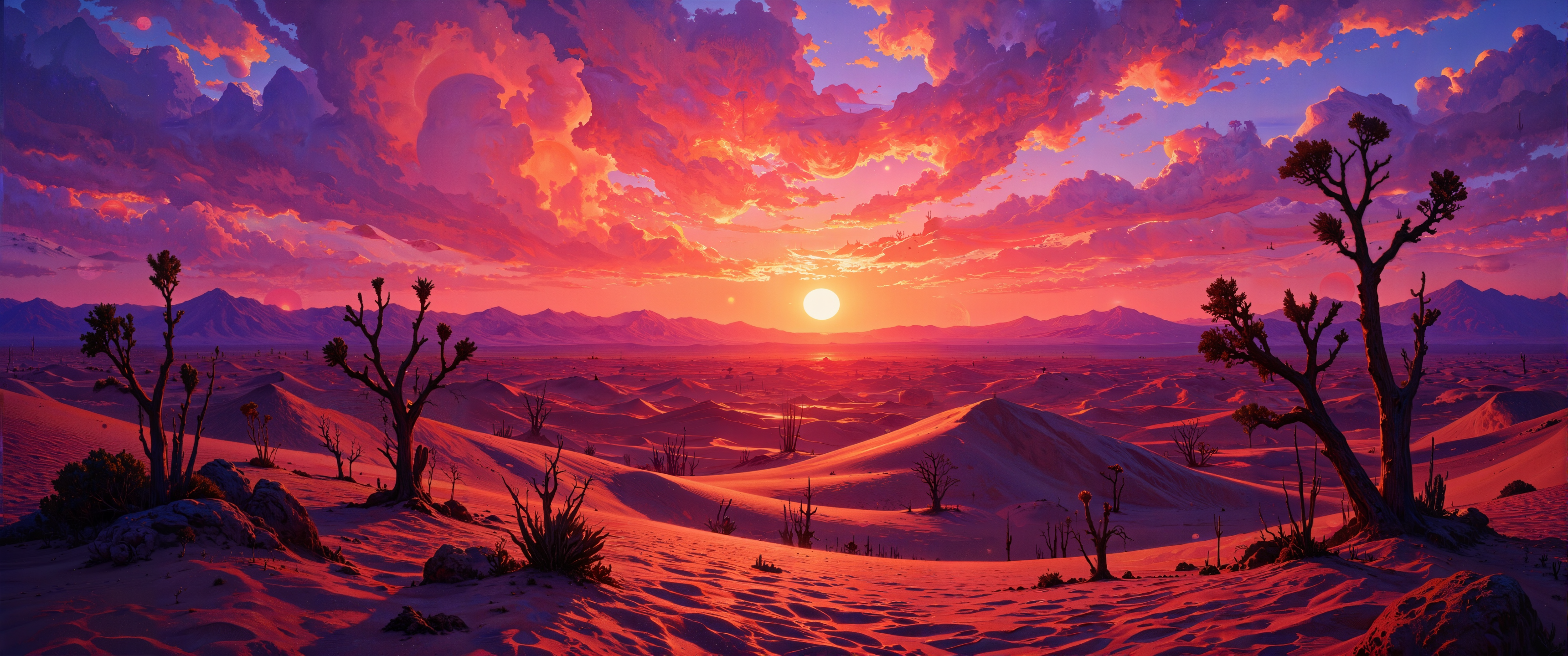 Shimmering sea of sand dunes bathed in golden-violet light, hypnotic rippling patterns casting long blue shadows across the desert. Massive sun hovering just above the horizon, swollen and amber-red, bleeding warm colors into stratified clouds. Atmospheric dust particles creating a diffused halo effect, scattering light through graduated pink to indigo sky. Desert flora silhouettes - twisted acacia trees and sentinel cacti - outlined in burnt orange against darkening background. Heat ripples distorting the distant horizon line. Textured foreground with wind-sculpted ridges in the sand catching last dramatic rays. Oil painting technique with impasto application, visible brushstrokes creating tactile dimension. Cinematic composition with dramatic depth perspective, visual journey from foreground texture to infinite horizon. Ultra-high resolution with meticulous detail in sand granules catching light, 8k hyperrealistic rendering with subtle color banding in sky gradient. <lora:Memadukan_Brush_Strokes_of_Fineart:0.6> <lora:FluxMythG0thicL1nes:0.8> <lora:flux_dev:1>