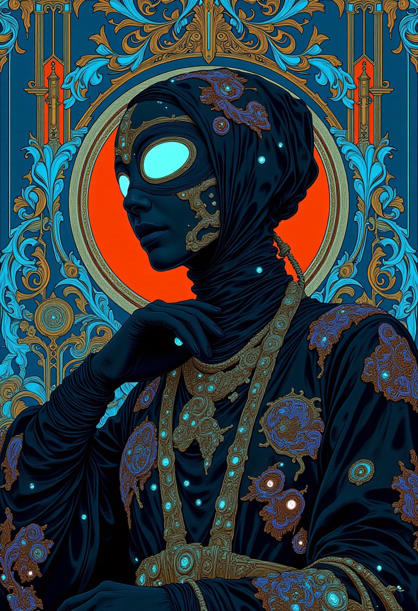 Hyper-realistic close-up illustration of a woman, wearing a modernized fusion of Turkish kaftan and cyberpunk elements. Her oversized, asymmetrical kaftan is meticulously detailed with intricate chrome embroidery and glowing fiber optic patterns in radiant violet and electric gold, inspired by the ornate elegance of Ottoman-era motifs. A sleek black blindfold, adorned with delicate neon pink embroidery forming intricate, glowing patterns, wraps around her eyes, adding an air of mystery and futuristic sophistication. The high turtleneck is crafted with metallic textures, embedded with shimmering crystals and pulsating cyan accents that radiate a soft yet vivid glow. She leans slightly forward, her hand resting near her collar in an aesthetic, poised gesture that blends grace and power. The background, a contrasting deep sapphire blue, is enriched with intricate geometric patterns and surreal swirling motifs in iridescent silver and glowing emerald, framing her in a dynamic interplay of traditional cultural elegance and cyberpunk innovation, emphasizing the richness of her attire and the bold statement of the blindfold.