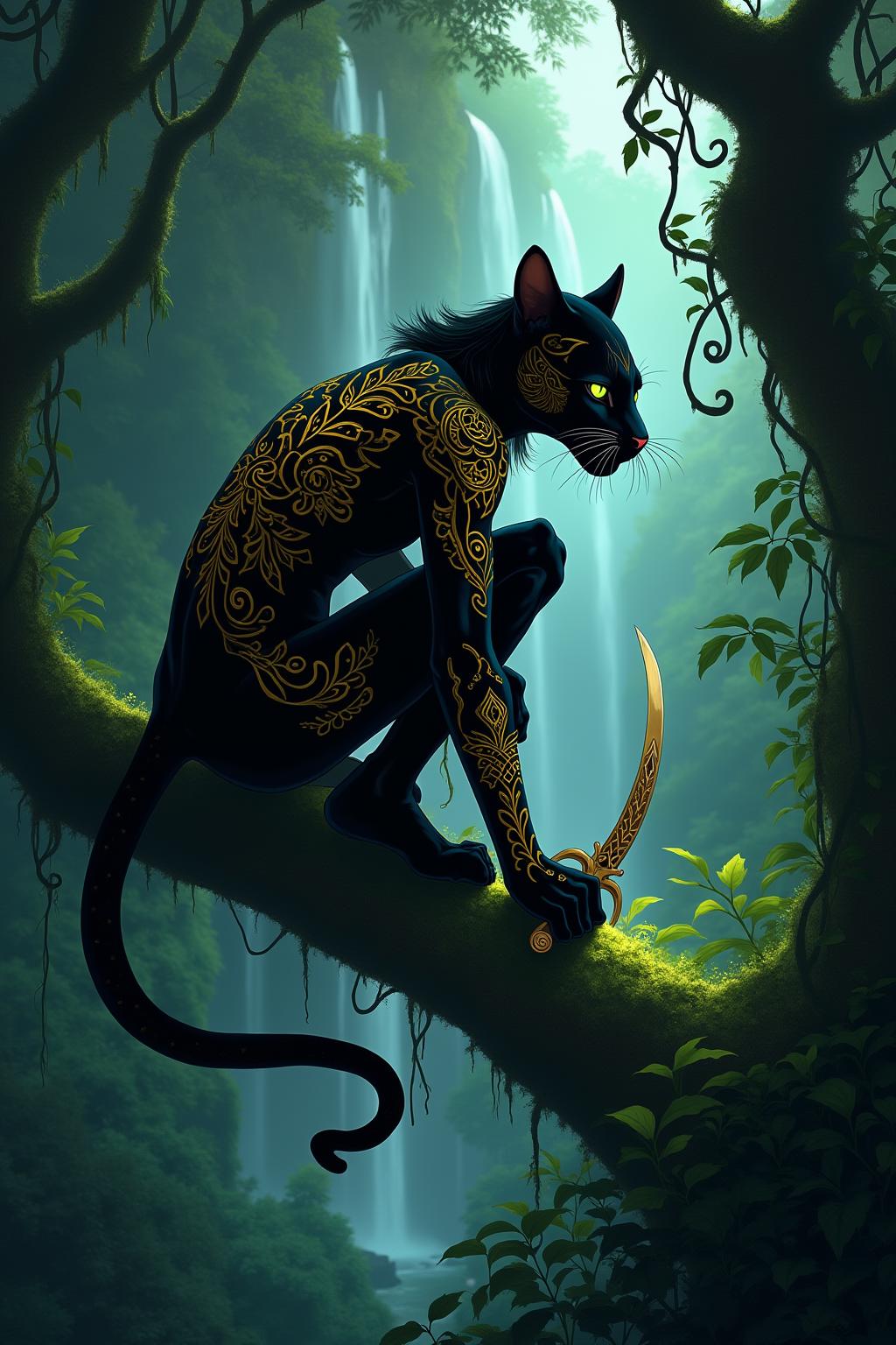Niji anime tribal fantasy style, a sleek black panther-woman crouched on the mossy branch of an ancient jungle tree, her glowing green eyes tracking unseen prey in the dense foliage below. Her body is adorned with golden tribal tattoos that pulse with the heartbeat of the jungle, and her twin curved daggers glisten with morning dew. Vines twist around her limbs like sentient guardians, while glowing bioluminescent plants illuminate the shadows. Behind her, waterfalls cascade through the mist, revealing ruins swallowed by time. The mood is stealthy and primal. Lush jungle color palette, intricate tribal markings, high-detail foliage textures, dynamic action pose.