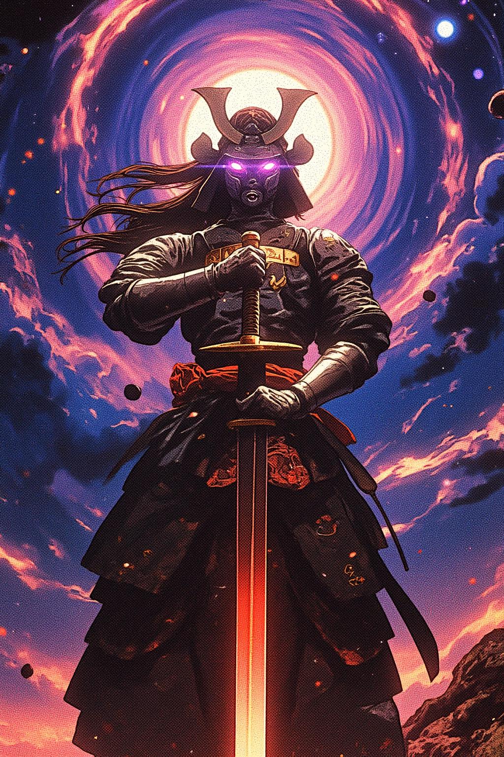 A cosmic anime warrior standing beneath a sky filled with swirling galaxies and nebulae. His sleek black and silver samurai armor glows with celestial inscriptions, and his katana hums with astral energy. His piercing violet eyes reflect the vastness of space as he prepares for an epic duel against an unseen celestial foe. Floating asteroids and radiant star trails create a dynamic, otherworldly battlefield. Cinematic lighting, ultra-detailed armor, deep space fantasy theme. <lora:retroanimefluxv1.jibQ:1.0>