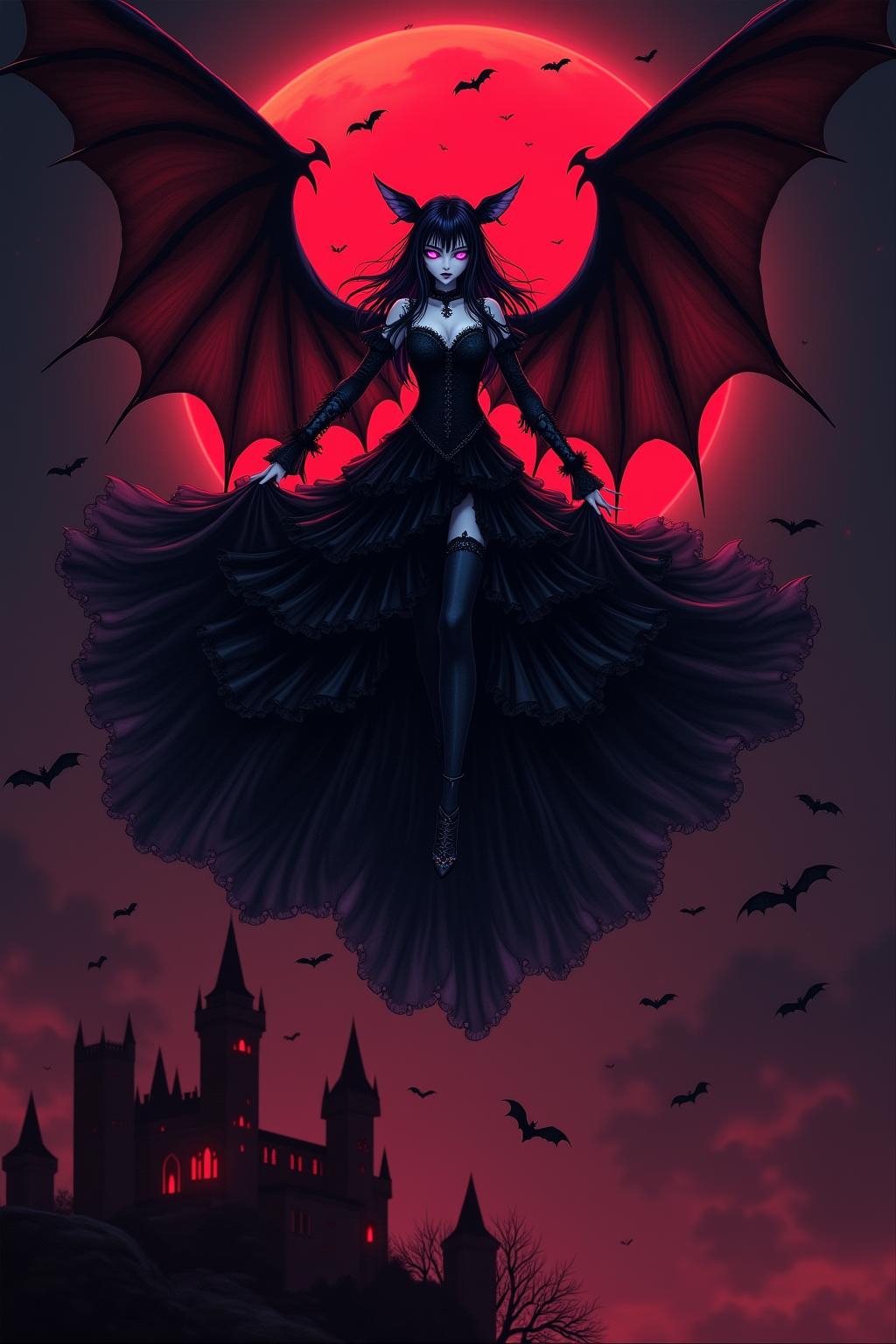 Niji anime gothic fantasy style, a hauntingly beautiful bat-woman queen hovering in the night sky, her massive wings spreading like a living eclipse as a crimson blood moon looms behind her. Her dark lace dress shimmers with silver embroidery, mirroring constellations that shift with every movement. Her violet eyes glow like molten amethyst, and shadowy bats swirl around her like sentient whispers of the night. Below, an ancient castle lies bathed in eerie red moonlight, its spires crumbling as the sky distorts. The mood is eerie and regal. Deep crimson lighting, intricate lace and feather details, dramatic gothic atmosphere, ethereal glowing effects.