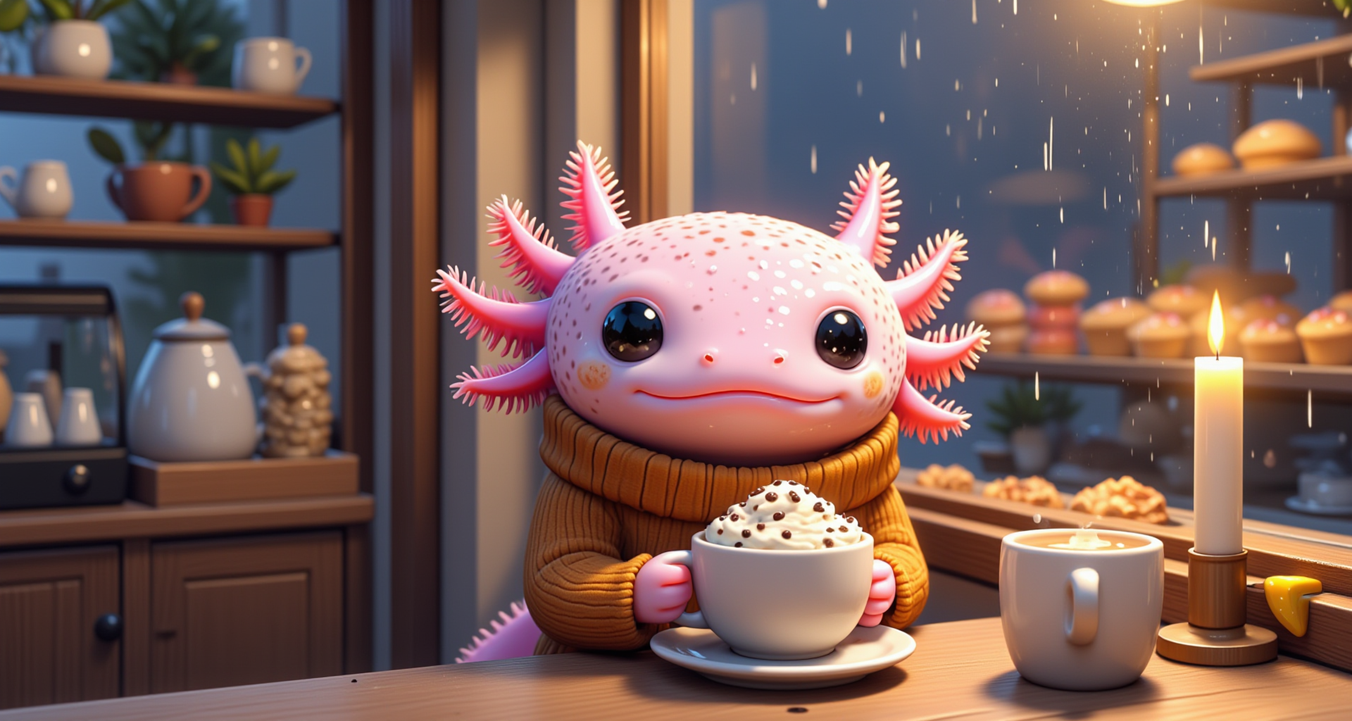 axolotl, xijie_crayon, close-up of a pink axolotl in a fluffy sweater, seated in a tiny café on a rainy day, holding a warm cup of hot chocolate topped with whipped cream and chocolate shavings; its round black eyes shine with contentment, and its frilly gills sway gently as it brings the cup close; rain softly taps against the window, creating delicate reflections, while candlelight flickers on the table, casting a golden glow; tilt-shift effect blurs the background shelves lined with pastries, coffee mugs, and potted plants, enhancing the caféâs intimate, cozy atmosphere<lora:xjie_crayon.safetensors:1.0:1.0> <lora:Axomodel_Flux_V2.safetensors:1:1>