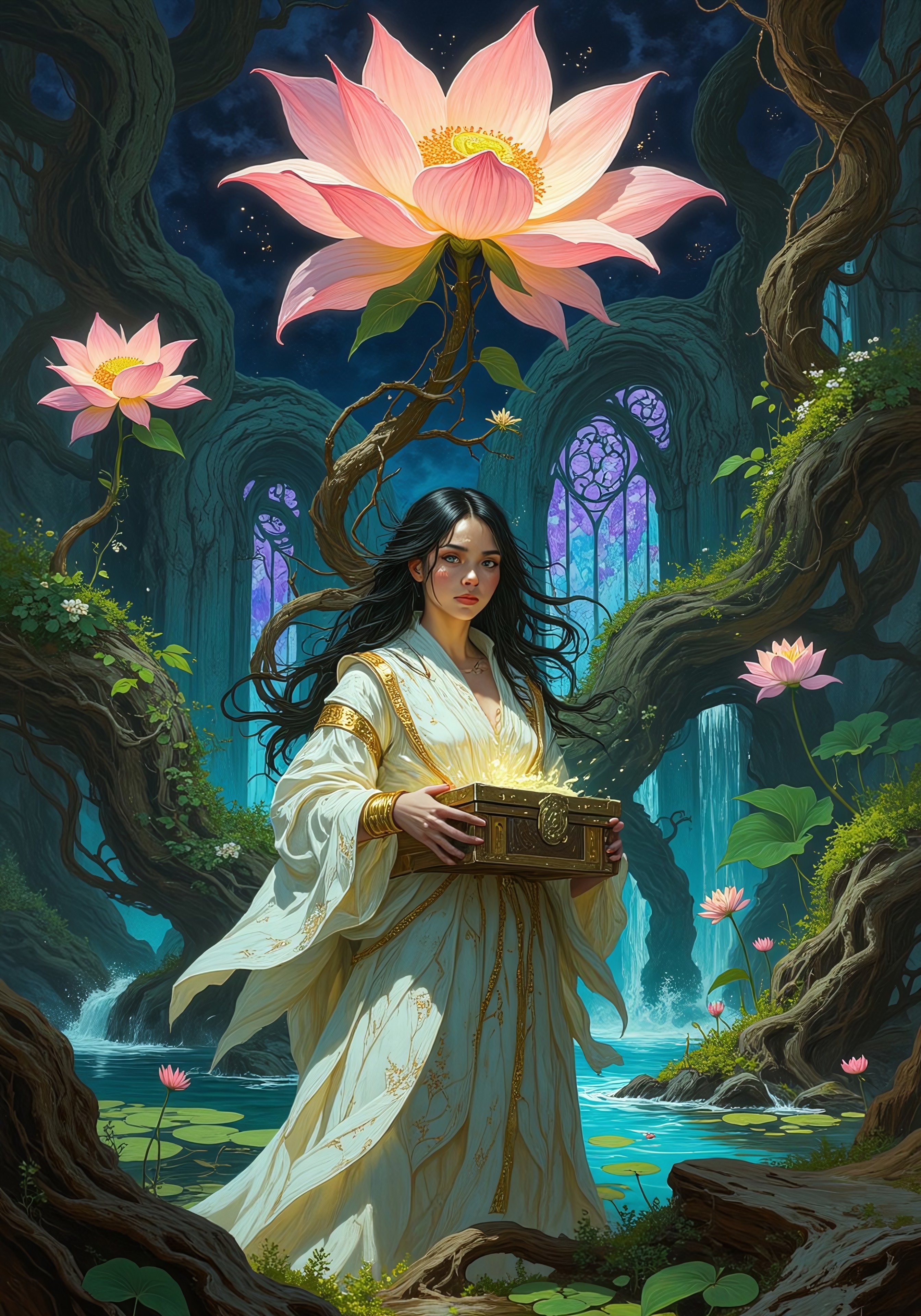 Intricate linework with expressive contrasts. A fantasy priestess with roots for hair stands at a 3/4 angle in the heart of an enchanted temple, woven from living vines and upheld by towering, luminous flower stems. Glowing sacred flowers behind her. Her noble face is serene yet powerful, softly textured like wood and framed by hairlike roots entwined with delicate blossoms. Her green eyes are soft yet determined. Subtle bioluminescent freckles shimmer across her skin. She wears golden arm bands and flowing white silk robes that billow in the wind. Translucent veils drift around her. In her hands, she cradles an ornate ceremonial open chest entwined with flowering tendrils, a gigantic seed inside. Behind her, the temple radiates an otherworldly splendor—arched doorways formed from intertwining branches, stained-glass petals filtering golden sunlight, and waterfalls cascading into pools where lotus blossoms drift. Enormous flowers the size of trees sway gently in the twilight, their bioluminescent petals casting hues of pink, violet, and gold across the temple’s moss-carpeted paths. The scene is illuminated by dramatic low-key lighting—cool shadows creating depth with warm, golden highlights. Fireflies flicker in the mist. Ultra-detailed, painterly textures, 8K resolution, atmospheric depth, mysterious and adventurous tone, Cinematic lighting, high fantasy, concept art style. In the style of ff-td, DB4RZ, DB4RZ style painting