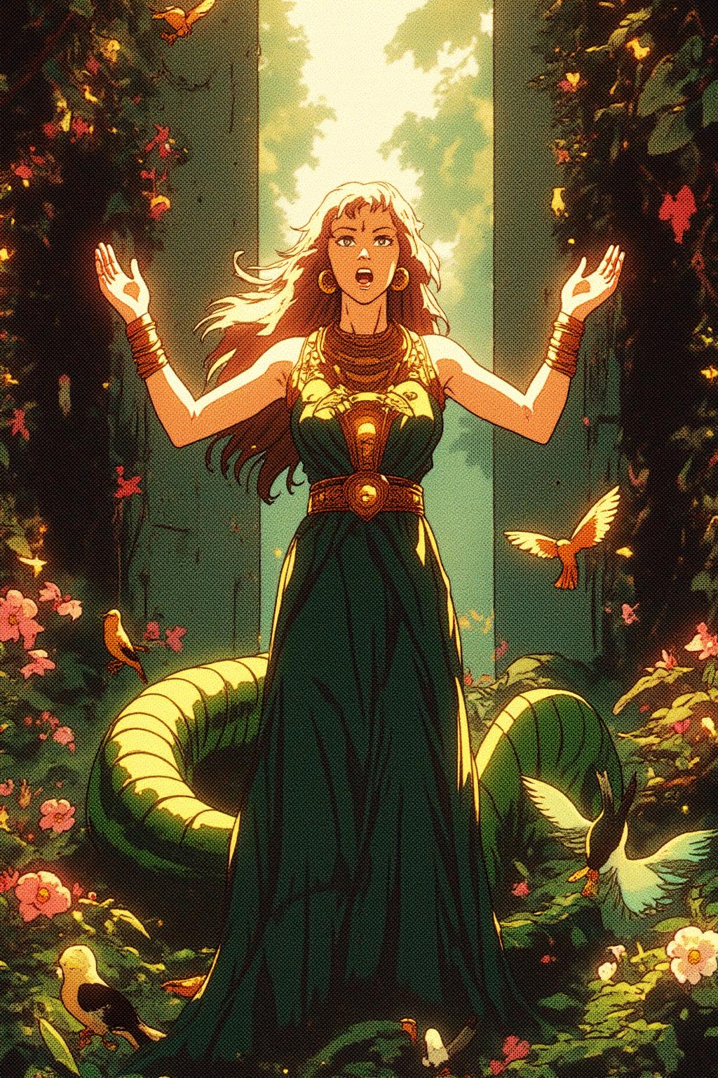 A mesmerizing anime-style illustration of a serpent goddess emerging from an ancient jungle temple, her emerald-scaled tail coiling elegantly around the ruins. Her golden eyes glow with primal wisdom, and her intricate tribal jewelry shimmers in the dappled sunlight. Vines and glowing bioluminescent flowers bloom around her as she raises her hands, summoning mystical energy. Birds and mythical creatures watch from the dense foliage. Highly detailed, soft atmospheric lighting, vibrant jungle colors. <lora:retroanimefluxv1.jibQ:1.0>