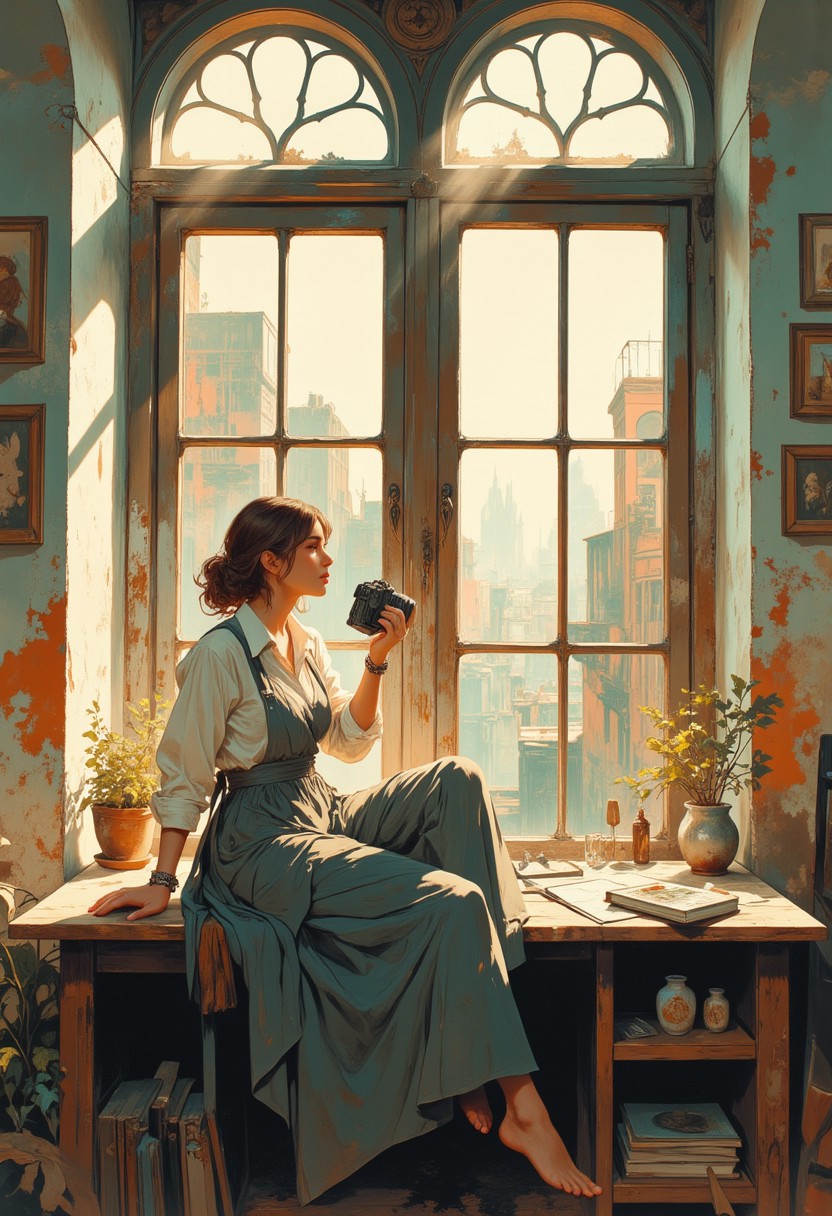 Intricate linework with expressive contrasts, low-key lighting with cool shadows and warm dynamic highlights.A captivating digital art image of a thoughtful woman seated sideways on a rustic wooden table near expansive, multi-pane windows, holding a sleek, modern camera close to her face as she gazes dreamily outward. Warm, diffused sunlight pours through the open upper panes, bathing the room in gentle golden hues and creating a harmonious interplay of soft shadows and luminous highlights. The scene is rendered in a vibrant yet muted color palette dominated by earthy tones of terracotta, sage green, and soft creams, accentuating the cozy, artistic ambiance of the urban apartment setting. The composition is carefully balanced, with the woman positioned slightly off-center against the geometric window frames, while painterly brushstrokes and subtle textures lend depth and warmth to the scene. Outside, blurred city buildings in pastel shades suggest a lively urban backdrop, enhancing the serene yet creatively charged atmosphere indoors. A small plant in a ceramic pot and casually arranged artistic objects scattered across surrounding surfaces add authenticity and charm to this intimate portrayal of peaceful contemplation and creative inspiration, digital illustration, warm realism, painterly style In the style of ff-td, DB4RZ, DB4RZ style painting