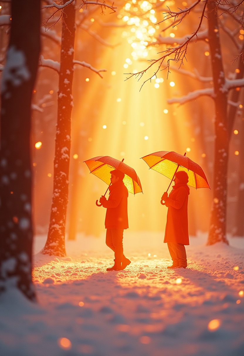 Step into a dreamscape where otherworldly hues dance gracefully against an ethereal backdrop. The celestial glow of spectral orange unfurls as spectral umbrellas stand regally on a white canvas of unblemished snow. Their gleaming surfaces reflect warm sunlight streaming through an optical prism, creating a dazzling chromatic display amidst the frosted landscape. Watch as light leaks gracefully around each silhouetted figure, giving them an aura of surreal beauty that transcends reality. In this photorealistic dreamworld, ordinary objects take on mystical qualities as they defy the laws of nature, melding seamlessly into a world where harmony and wonder collide, painted with a palette of warm orange hues juxtaposed against the pristine whiteness of freshly fallen snow.