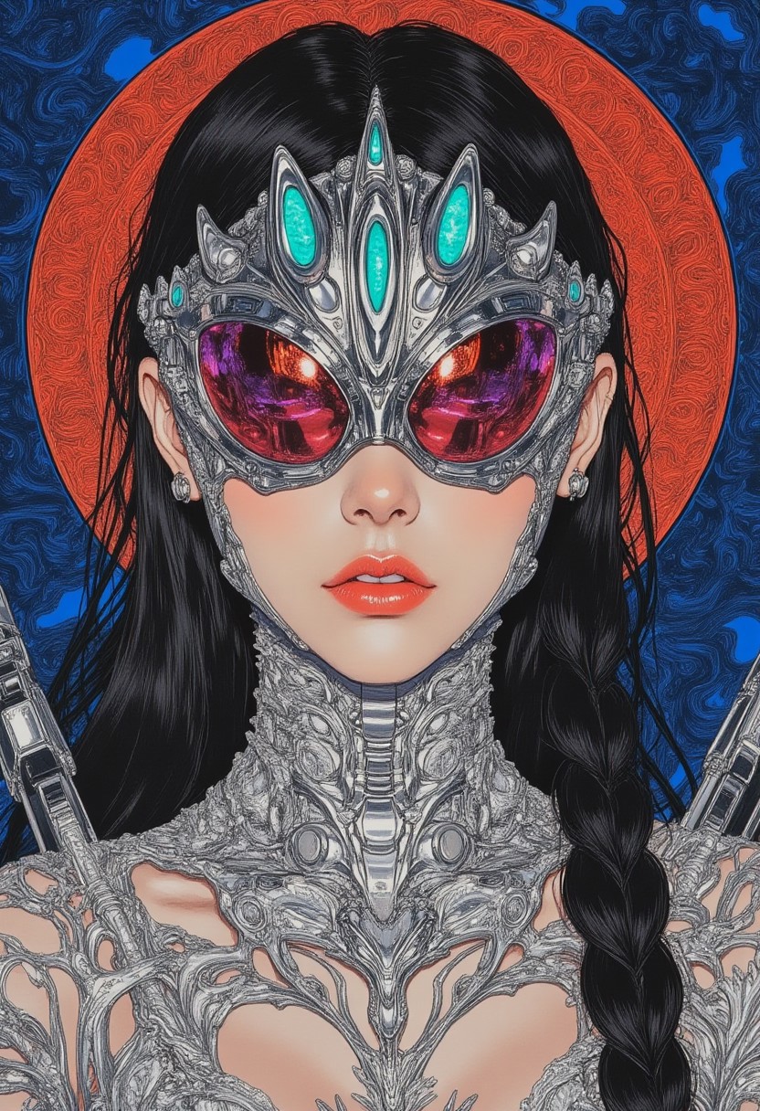 (pingtu style, illustration-fen) A hyper-realistic close-up portrait in HD, 8K, capturing a futuristic woman with an avant-garde, fan-shaped mask crafted from razor-thin sheets of titanium, radiating outward like a mechanical lotus. The metallic surfaces shimmer with shifting hues of electric blue, molten gold, deep crimson, and pearlescent white, reflecting ambient light. She wears a high-tech, second-skin bodysuit covered in intricate lace-like patterns made of interlocking silver and neon green threads, seamlessly woven with accents of amethyst purple, cobalt blue, and fiery copper. Her long, sleek obsidian-black hair is braided into thick, segmented strands, each adorned with delicate bioluminescent ornaments. The background is deep indigo with intricate tessellated mandala patterns in glowing ruby red, sapphire blue, and metallic bronze, arranged in a rhythmic, kaleidoscopic formation. Soft yet dynamic lighting enhances the fine engravings on her mask and the intricate textures of her attire, blending avant-garde fashion with futuristic surrealism.