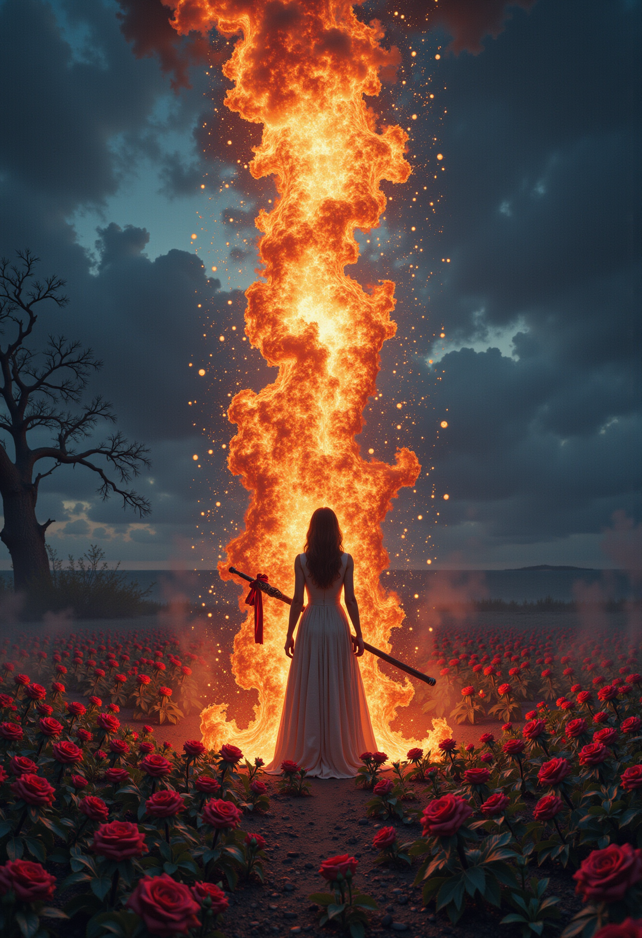 SurrealJohansson, A highly detailed, surreal photograph of a Summoner standing in a field where her staff cracks the ground, revealing an ocean of swirling galaxies from which Ifrit emerges, his flames folding into a tapestry of burning roses. The scene is sharp and hyperrealistic.