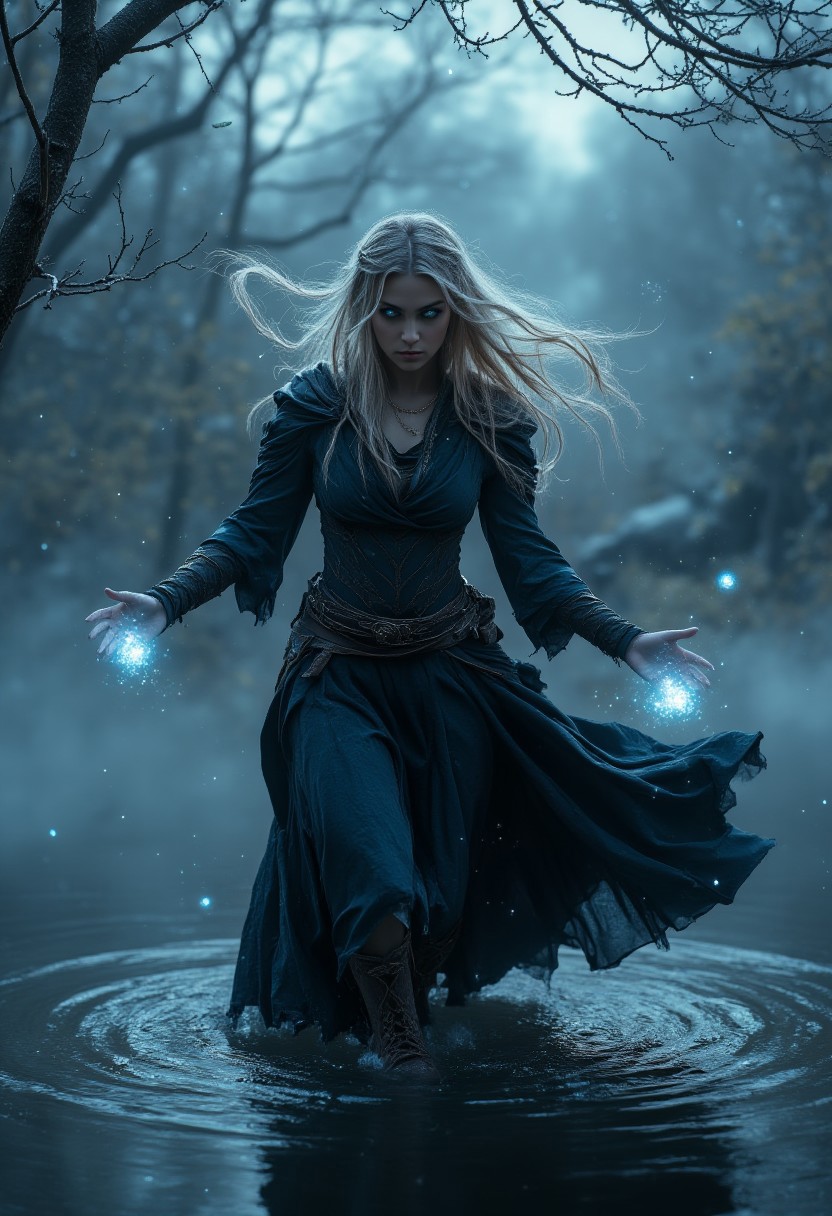 The Witch of the Black Lake "A ghostly woman in a flowing, tattered black gown rises from the mist-covered waters of a cursed lake. Her silver hair floats weightlessly around her, and her glowing white eyes pierce through the fog. Dark tendrils of energy swirl around her hands, while skeletal branches loom overhead like twisted, watching sentinels."