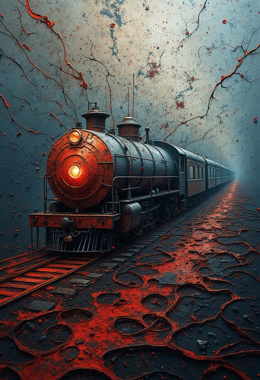 In a dreamlike expanse, an enigmatic train dances amidst a tapestry of abstract fluid forms. Its metallic frame intertwines with swirling tendrils of mercurial paint, infused with crimson hues that slowly merge into the depths of twilight blues. As waves of somber shadows cascade across this ethereal scene, they mingle with ebony ribbons that race towards infinity. This mesmerizing visual symphony embraces the viewer with its rhythmic dynamism and intricate harmony - a testament to the unbridled beauty found within abstraction. ,<lora:flux/fav/ByElement.safetensors:1.0:1.0>