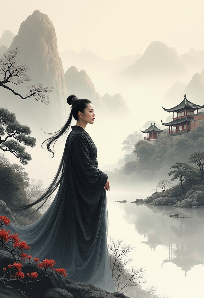 Witness a profound moment of serene elegance, portrayed in an ink wash painting style. Within a graceful Asian landscape overflowing with serene beauty and traditional houses, there stands a single figure of quiet power. Every stroke of the brush, echoing ancient artistry, conveys the dignified presence of this esteemed individual, capturing every fluid movement and striking feature with careful precision. An atmospheric palette of deep blacks and soft grays merges seamlessly, embodying the tranquil energy that pervades both figure and setting alike. The paper appears alive with delicate ink swirls and glimmering reflections, enhancing the poised poise and silent strength radiating from the figure. The landscape envelops him as one with nature itself, embodying an enduring bond between man and ancestral heritage.