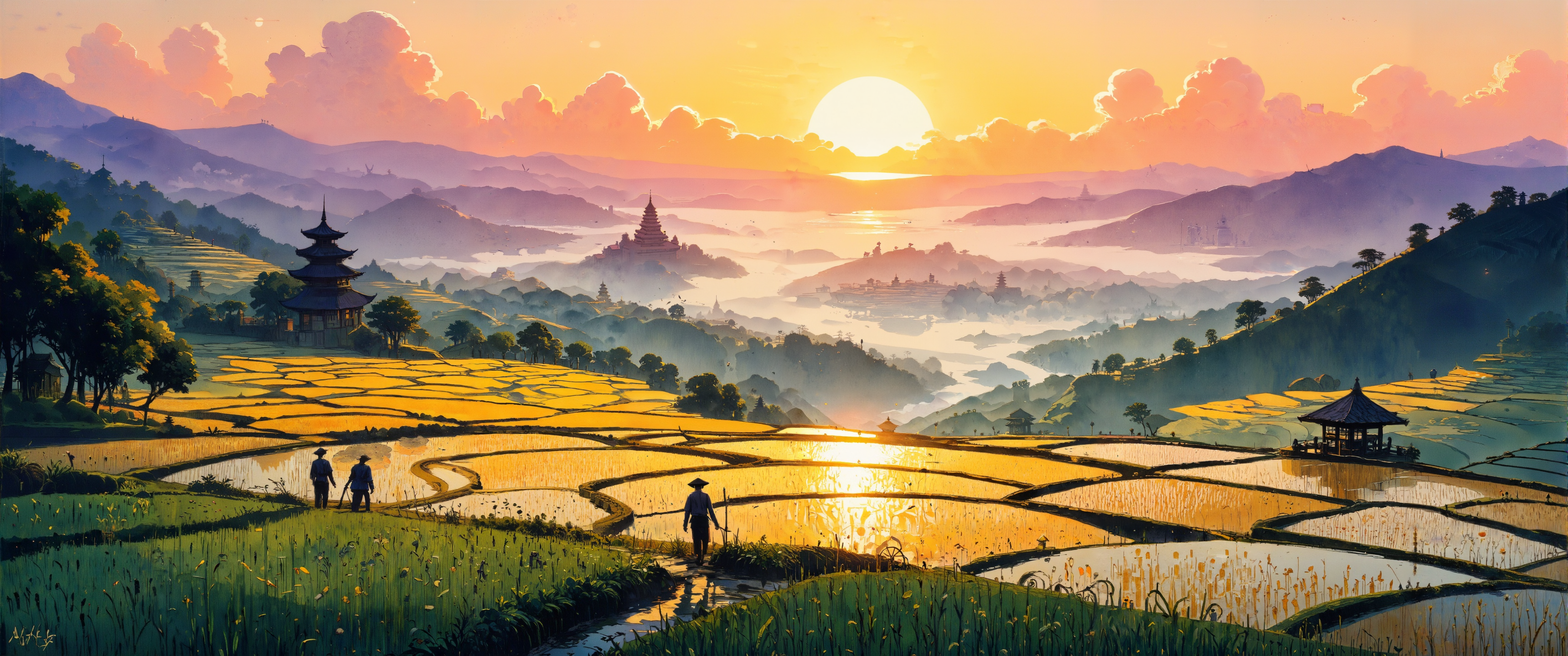 Terraced rice fields reflecting first light of dawn, their mirror-like surfaces capturing fractal patterns of amber and gold. Ancient wooden water wheels casting long shadows across fertile valleys. Morning mist curling through bamboo groves along distant ridgelines. Soft watercolor technique creating dreamlike transitions between emerald terraces and purple-hued mountains. Silhouettes of farmers with conical hats moving through stepped landscapes. Delicate brushwork capturing dewdrops on rice shoots. Atmospheric perspective rendering furthest mountains in faded lavender. Sun's rays creating luminous highlights on water's surface. Billowing clouds tinged with coral and saffron. Traditional pagoda partially visible through dissipating fog. Impressionistic style with flowing gestures and harmonious composition. Masterful interplay of shadow and illumination. Tranquil mood with elements of timeless rural harmony. <lora:artilands:0.3> <lora:CPA:0.7> <lora:bm-goth_epoch_1:0.4> <lora:Organic Sauce - FLUX:0.8> <lora:flux_dev:1>