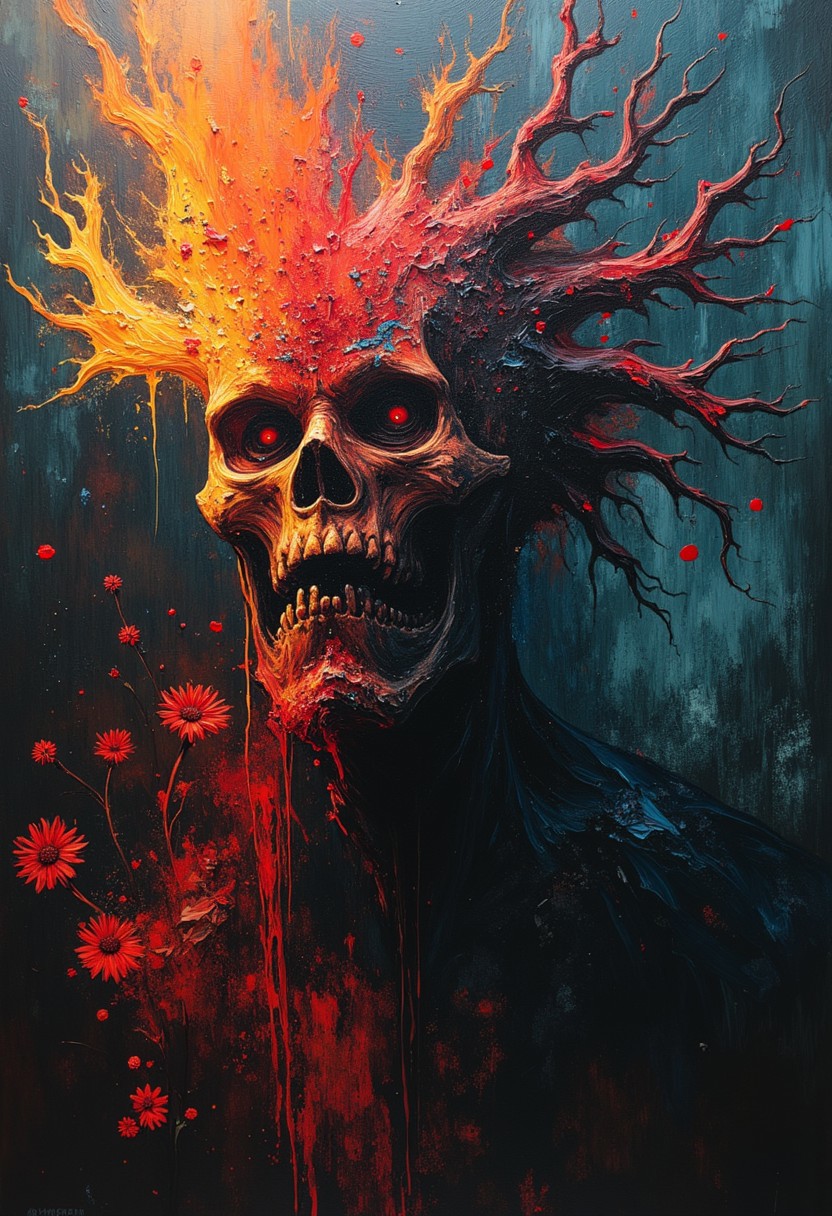 thepaintedrealm. Oil painted and horror art style. Create a unexpected fantasy image that combines the style of oil painting and horror painting.