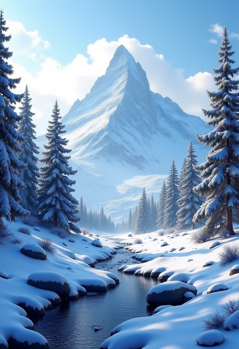 (High-quality, ultra-resolution, light and shade contrast).deep focus. Wide Shot. [Cool, ethereal lighting with a touch of blue]. A vast, snowy mountain range dominates the landscape, its peaks piercing the clear blue sky. A small, winding stream meanders through the mountains, surrounded by smooth, rounded rocks and boulders. A thick layer of pristine snow covers the ground, reflecting the soft light of the sky. Tall, dark spruce-like trees stand sentinel over the landscape, their branches heavily laden with snow, creating a picturesque winter wonderland. The sky is a clear, pale blue, with scattered white clouds that drift slowly across the horizon. Sunlight glints off the snow, creating a sparkling effect that illuminates the entire scene. A sense of isolation and tranquility pervades the landscape, a feeling of peace and serenity. The air is still and silent, broken only by the gentle whisper of the wind. The scene evokes a feeling of awe and reverence, a reminder of the beauty and power of the natural world. Detailed snowdrifts, subtle variations in snow texture, and realistic tree branches add to the immersive quality of the scene. The landscape is a pristine wilderness, untouched by human hands.