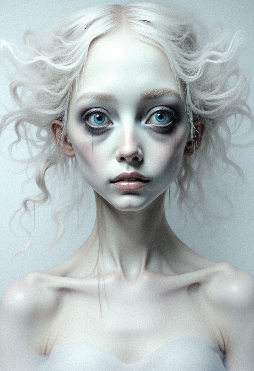 Dark Art, A surreal, otherworldly close-up of an ethereal goddess—hauntingly beautiful, radiating both innocence and raw, magnetic sensuality. Her pale, radiant skin dissolves into the white void, making her seem like a creature of pure light. Her massive, crystalline blue eyes hold an intoxicating gaze, their depth pulling the viewer into a trance of awe and longing. Her delicate, sculpted features are almost too perfect—high cheekbones, a refined nose, and full, inviting lips that glisten as if kissed by celestial dew. Her platinum-white hair defies gravity, flowing like liquid silk, framing her angelic face and bare, exposed shoulders. Her décolletage is barely veiled in a sheer, weightless fabric, teasing the divine curves beneath, catching the glow of the surrounding light. Wisps of white ash swirl around her, as if she has just stepped from the remnants of a sacred fire. The lighting erases all shadows, enhancing her divinity—an intoxicating mix of purity and untamed desire, suspended in a dream of endless white.