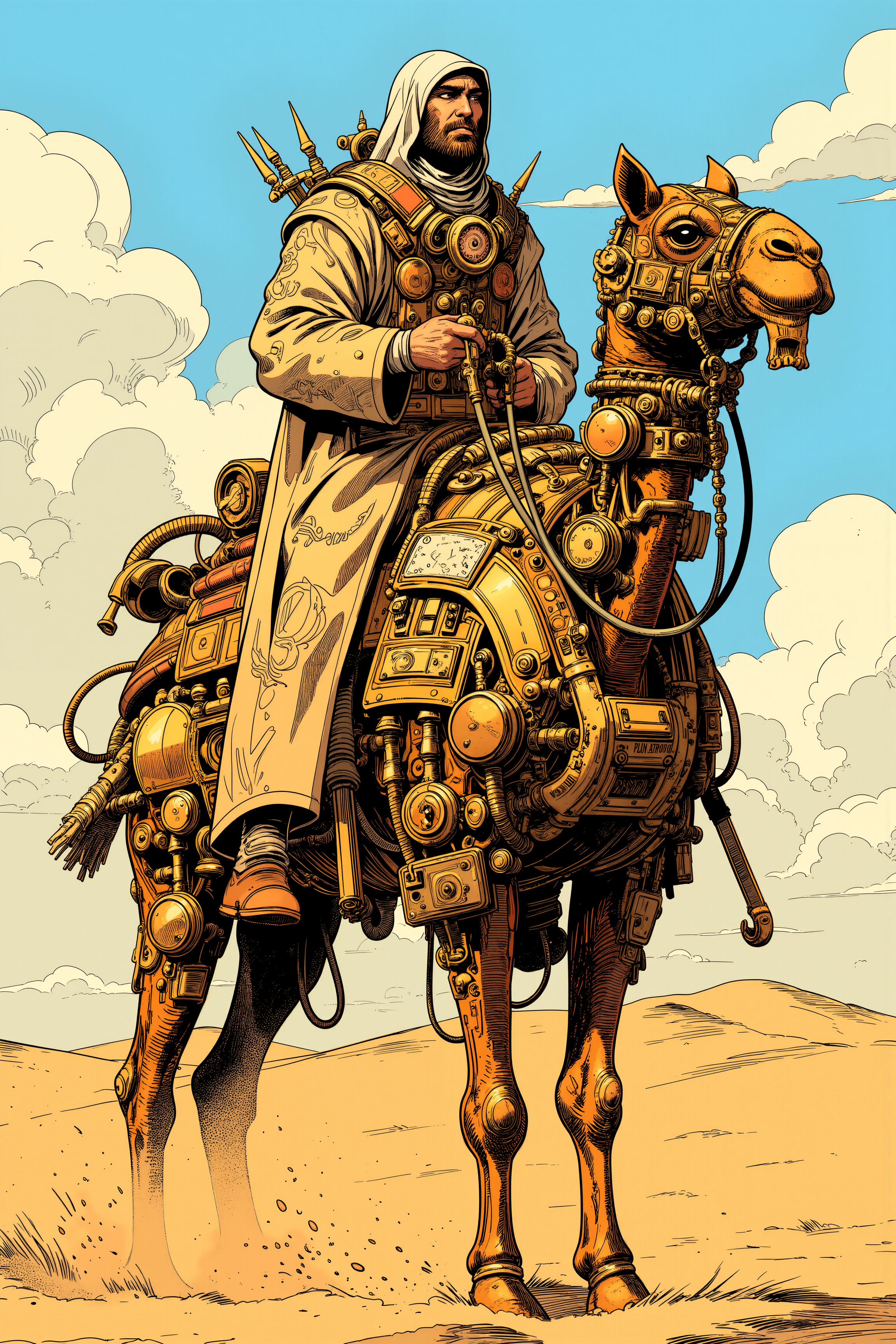 A nomadic desert artificer with intricate sand-colored robes, covered in mechanical gadgets and solar-powered clockwork devices, riding a biomechanical camel with copper and brass components.,meiman_style,This is a retro comic book style digital illustration, <lora:meimanstylev2:0.4><lora:Vintage comic book:0.4><lora:RetroAnimeFluxV1:0.15><lora:Greg_Capullo_style:0.4><lora:jeanClaude_Mzires_Style_FLUX-000001:0.4><lora:Flux_Ink_Anime:0.4>
