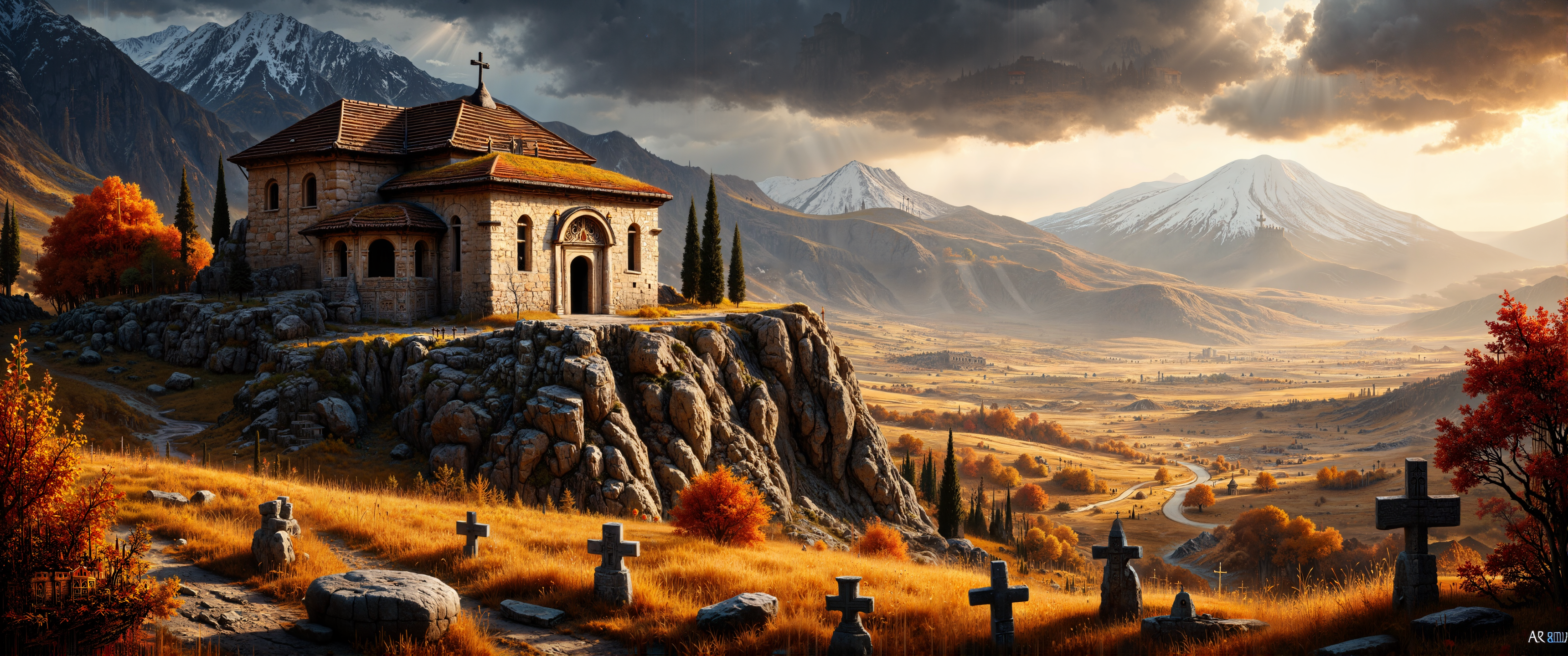 Ancient Armenian stone monastery perched dramatically on the edge of a rugged cliff face, surrounded by snow-capped volcanic mountains under a dramatic stormy sky. Golden autumn fields stretch into the distance, dotted with ancient khachkar stone crosses. Ethereal beams of sunlight pierce through dark clouds, illuminating the centuries-old architecture with warm light. Rich watercolor painting capturing the atmospheric depth of the Armenian highlands with traditional cross-stones in foreground, cypress trees swaying in the mountain winds, and distant view of Mount Ararat. Photorealistic details of weathered stone textures, vibrant fall foliage in crimson and amber hues, and traditional Armenian architectural elements with intricate carved details. 8K, dramatic lighting, golden hour, composition with strong foreground elements leading the eye to the distant sacred peak. <lora:flux_vividizer:0.4> <lora:UkiyoFusion-FLUX:0.6> <lora:MysticFantasy:0.2> <lora:flux_dev:1>