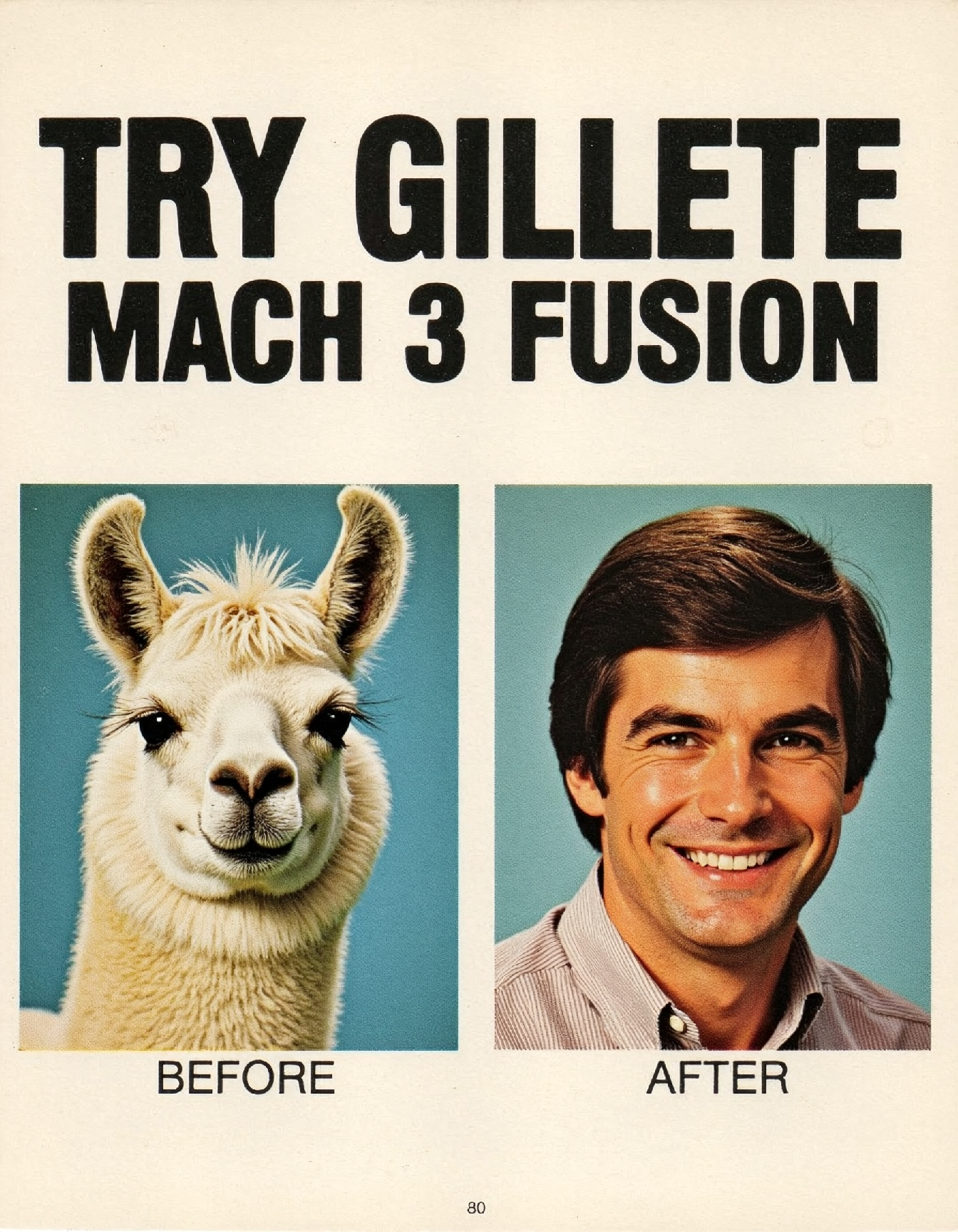 vintage 'before & after' ad. The headline reads "TRY GILLETE MACH 3 FUSION" in bold typography. The ad features a dramatic before-and-after comparison. The "BEFORE" image shows a llama. In the "AFTER" image, is a man.