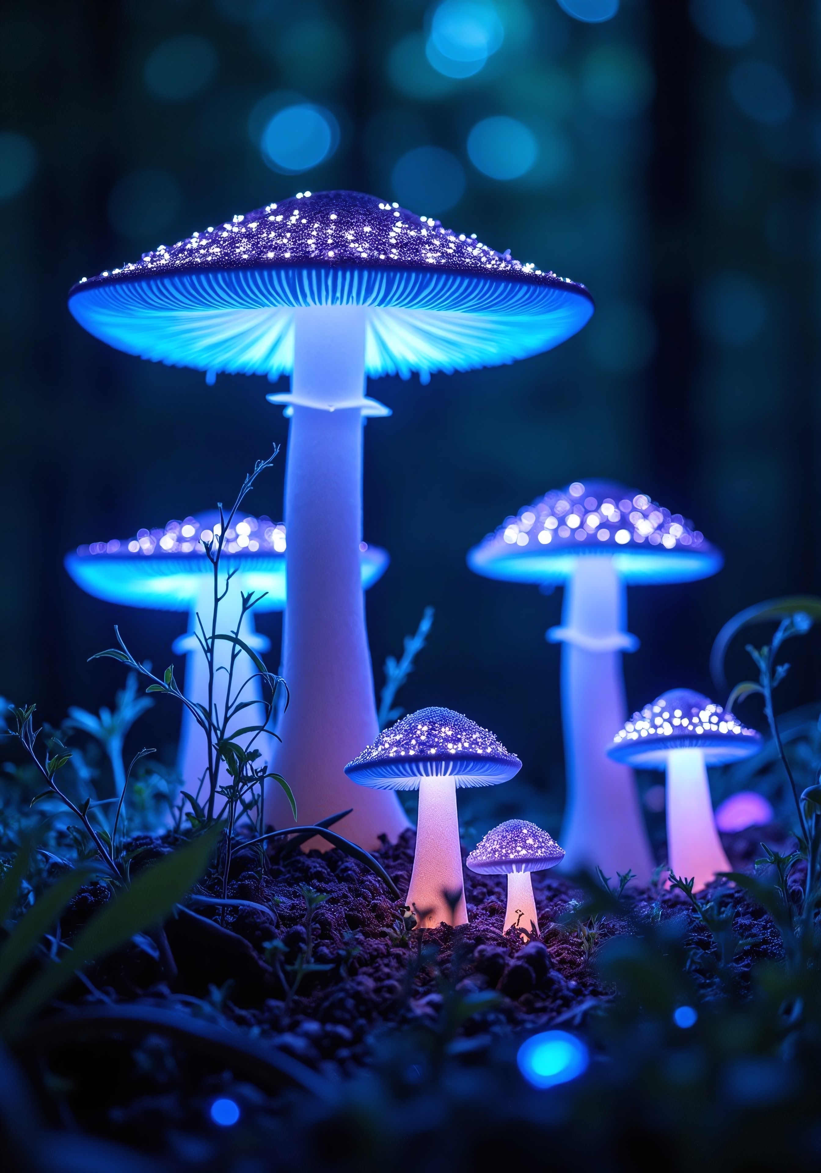 A glowing bioluminescent forest at night, with giant mushrooms and strange plants emitting a soft blue and purple light.