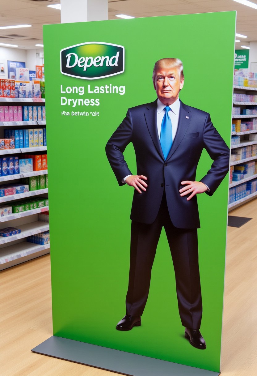 High-resolution photograph taken inside of a pharmacy store, showcasing a large, detailed, 3D cardboard cutout of Donald Trump with his hands on his hips and text ”Long Lasting Dryness” with a Depend logo against a green background