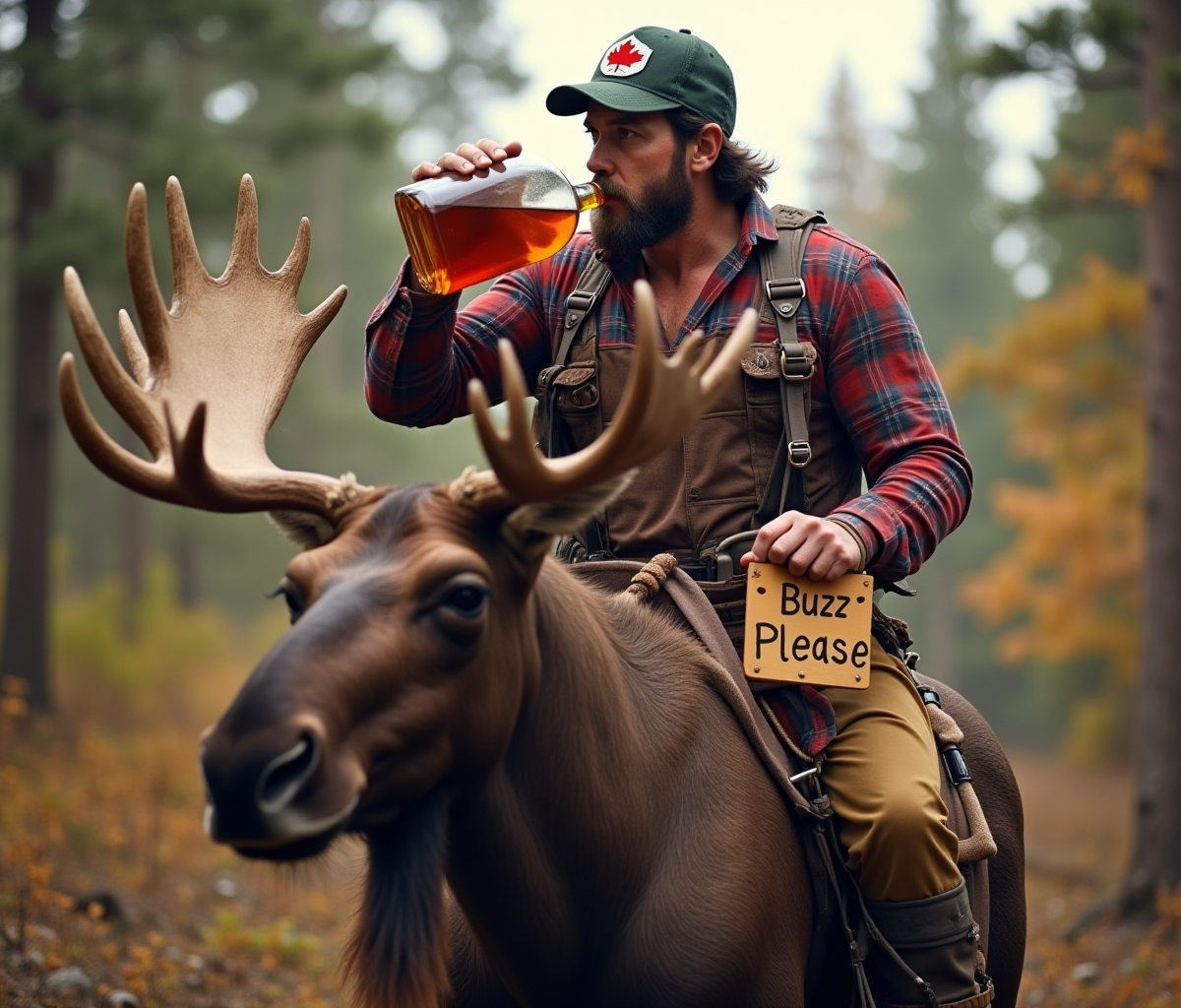 an epic Canadian lumberjack drinking from a glass jug of maple syrup. He has massive muscles, and rides a majestic moose in a northern forest rich with pines and maple. He wears a touqu with a maple leaf logo and a plaid shirt and is holding a sign that says "Buzz Please"