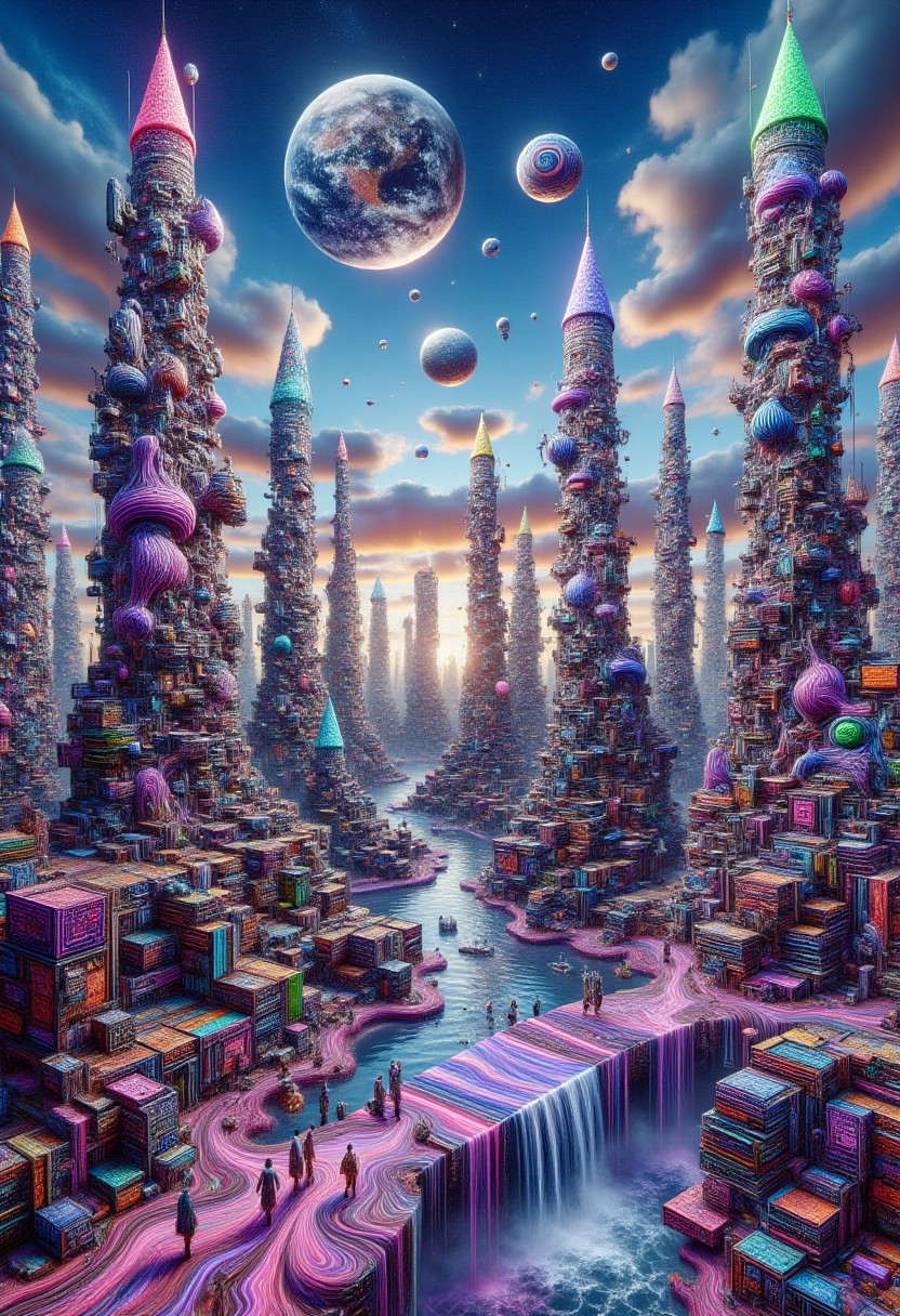 A futuristic metropolis where all buildings are made of shifting, sentient mercury. The streets flow like rivers, reflecting distorted images of neon-clad citizens who morph and change as they walk. The sky is a swirling kaleidoscope of colors, mirroring the thoughts of the inhabitants. Cyber-surrealism, liquid physics, neon reflections, dreamlike, sci-fi dystopia, hyper-detailed.
