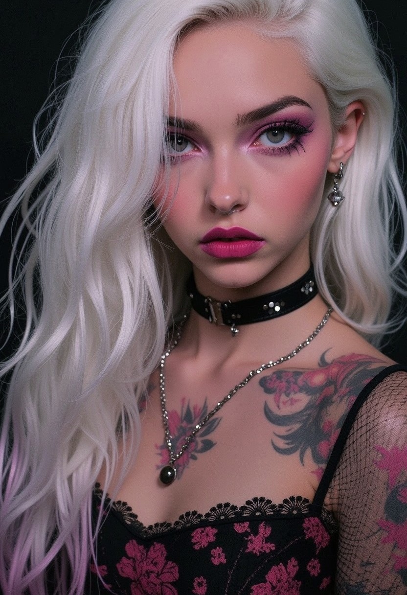 closeup of a goth woman with long flowing white hair, big magenta eyes, subtle pink eye liner, gorgeous lips, perfect makeup, chocker, fishnet shirt with flower tattoos, dead look in her eyes