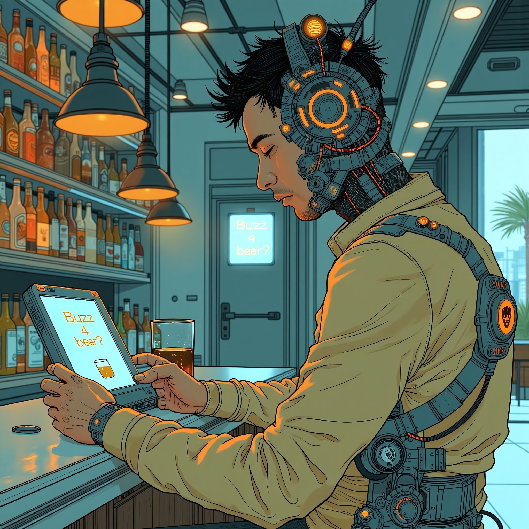 a man with cybernetic implants sitting at a futuristic bar, he holds a tablet that says “Buzz 4 beer?”