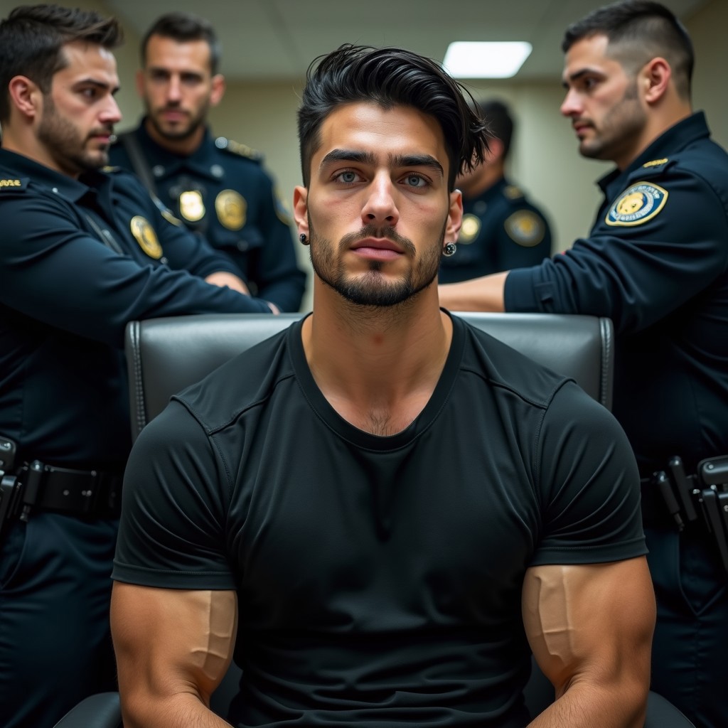 a realistic photo, hdr, of a beautiful 18yo bodybuilder Italian man in a tight fitting black capped sleeved T-shirt with a plunging neckline showing off his massive pecs. He has bright blue eyes, black hair, earrings, narrow waist and he is sitting back in a chair in a police station surrounded by male cops