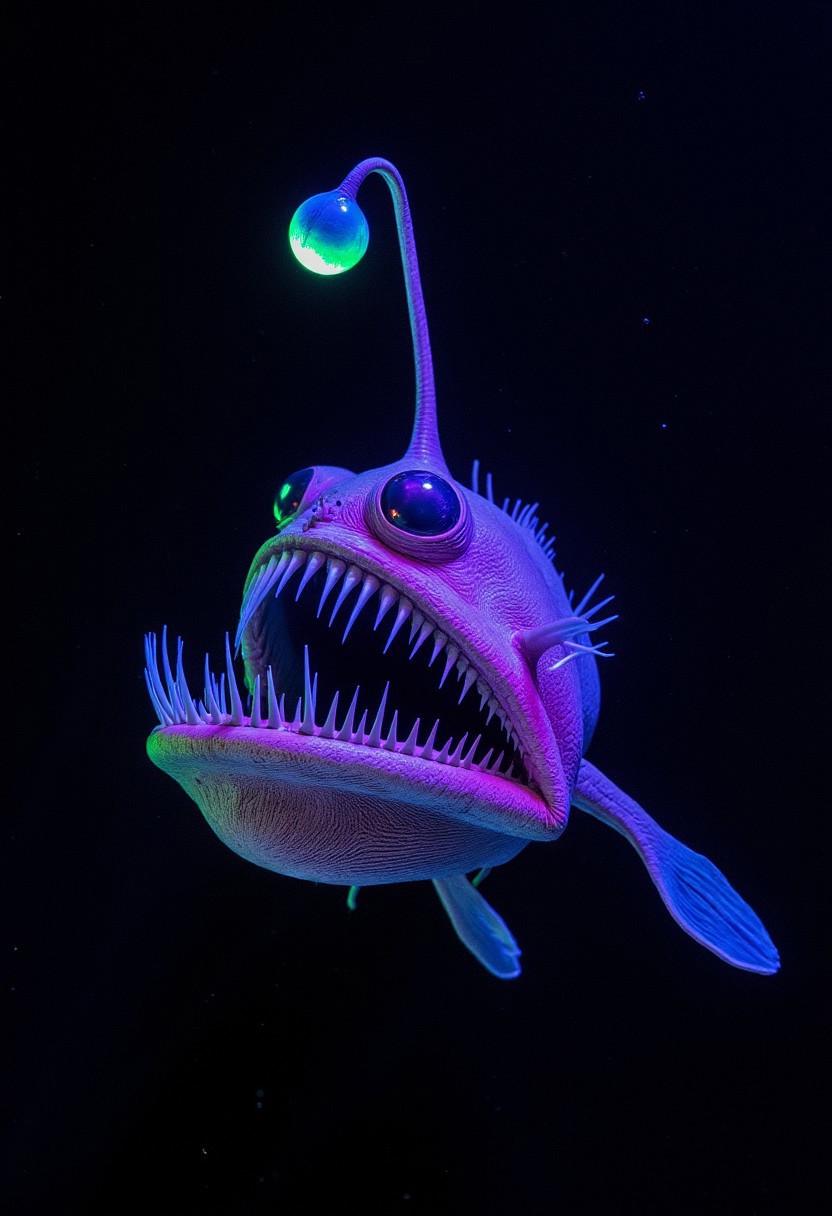 In the abyssal depths where no light dares to reach, a monstrous yet mesmerizing anglerfish drifts through the inky blackness. Its bioluminescent lure glows in hypnotic hues of electric blue, neon pink, and eerie green, casting shifting reflections across its jagged, armored skin. Razor-sharp teeth glisten like shattered glass, yet its oversized, ghostly eyes hold an almost cozy, unsettling wisdom—an ancient predator at home in the void. The water is thick with swirling particles, a dreamlike haze of darkness and light. Shadows stretch unnaturally, morphing into phantom-like shapes that dance around the glowing horror. The atmosphere is both terrifying and strangely inviting, like a nightmare you don’t want to wake from.
