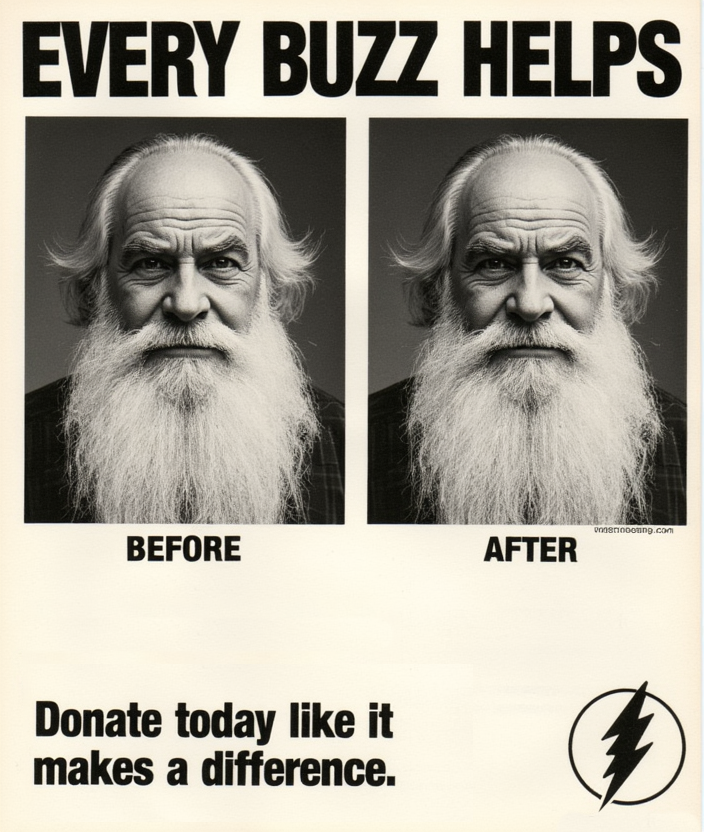 w1z_b4-4ft3r, vintage ad. The headline reads "EVERY BUZZ HELPS" in bold typography. The ad features a dramatic before-and-after comparison. The “BEFORE” image shows a grumpy Wizard Whitebeard with white beard, frowning, pouting lips. In the “AFTER” image, the same Wizard appears significantly happier, with a large smile on his face. A small text say "Donate today like it makes a difference". In the bottom corner is a 1970s style logo that depicts a lightning bolt symbol.