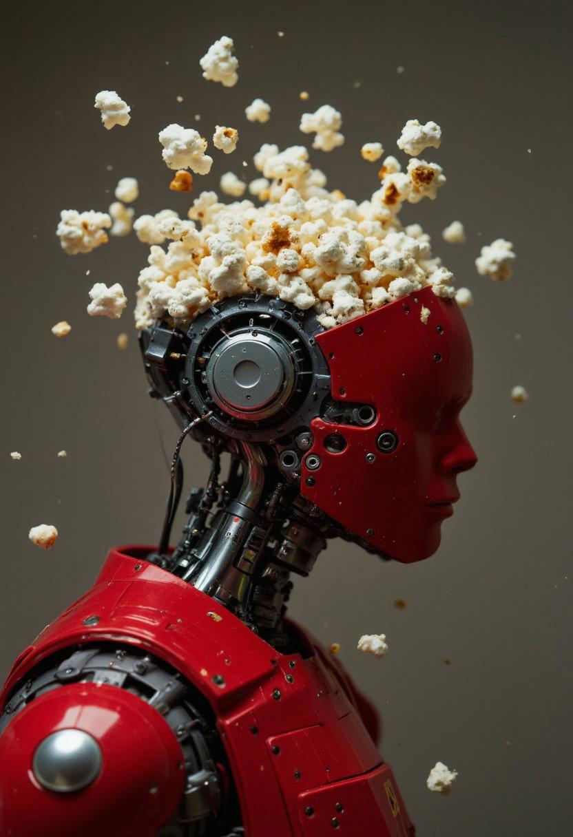 Cybernetic humanoid figure, predominantly red, glossy finish, metallic accents. Headpiece filled with popcorn, creating a visual focal point. The robot's head and neck are detailed with visible mechanical components, dark gray and black wires and connectors. Intricate, detailed design of the exposed machinery. The figure is posed in a three-quarter profile view, slightly angled to the right. A muted grayish-brown background complements the vibrant red and pops of white popcorn. The perspective is a medium close-up, focusing on the robot's head and upper torso. Soft, diffused lighting creates subtle shadows, emphasizing the form. Popcorn kernels float and hover around the figure, suggestive of a dynamic, animated scene. The style is futuristic, sci-fi, and almost surreal. The overall atmosphere is one of quiet anticipation or contemplation. The detailed mechanical design of the robot is contrasted with the unexpected popcorn filling the head, suggesting a curious and perhaps humorous juxtaposition of technological advancement and commonplace entertainment.