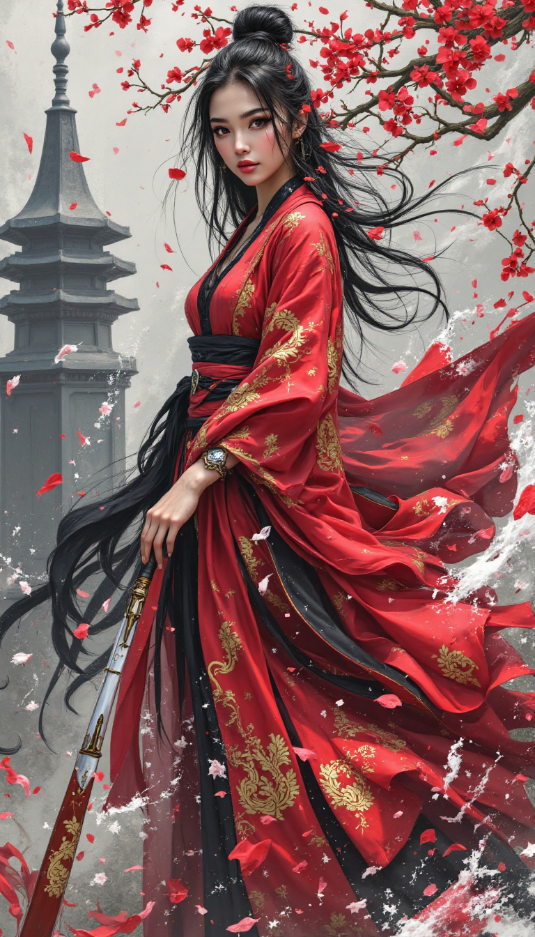 A young woman, with dark hair in a bun, wearing a vibrant red kimono-style dress with gold accents, and dark fabric draped over her. She is holding a stylized red weapon. The setting is a stylized Japanese-inspired garden or temple, with elements of white, grey, and red. There are blossoming cherry blossoms. Paint strokes, in a style reminiscent of impressionist painting, are visible on the background, using vibrant colors like red, white, and grey. The image has a painterly, slightly hyperrealistic quality to it. A dark grey structure, possibly a lantern pillar, is subtly integrated into the background. The colors are bold, dynamic, and layered. Lots of dynamic and swirling implied movement, with flowing red robes and weapon. Focus on detailed textures and patterns on the clothing. Signature/stamp in the bottom corner. aidmafluxpro1.1 ; aidmaHyperrealism <lora:aidmaFLUXPro1.1-FLUX-v0.3:0.6> <lora:aidmaHyperrealism-FLUX-v0.3:0.6>