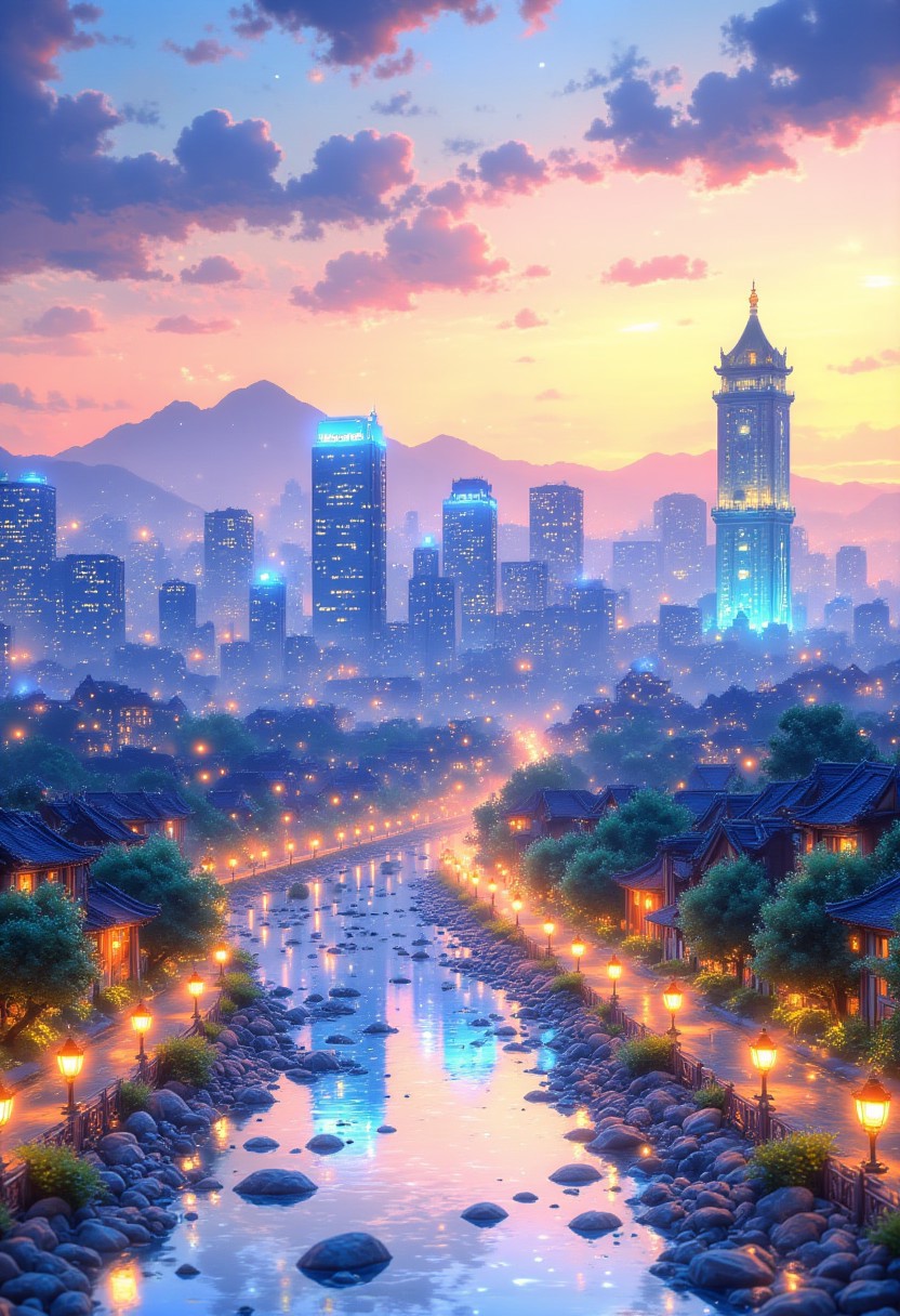 Nanjing Skyline at Sunset "Nanjing’s skyline at sunset is a stunning fusion of ancient history and modern architecture. The majestic Zifeng Tower rises above the city, glowing in the warm evening light. The Qinhuai River reflects the fiery hues of the sunset, while traditional pagodas and historic city walls stand alongside sleek skyscrapers. The soft mist over the distant Purple Mountain adds an ethereal touch."
